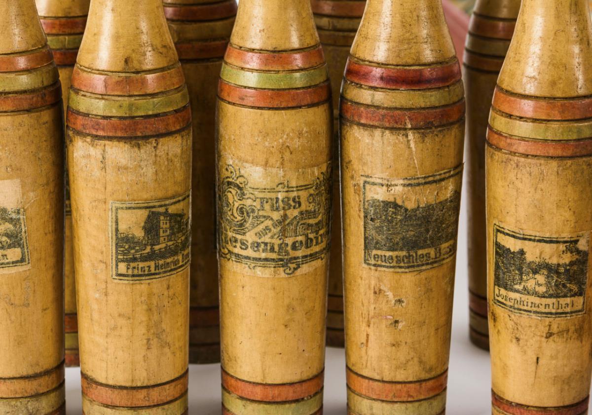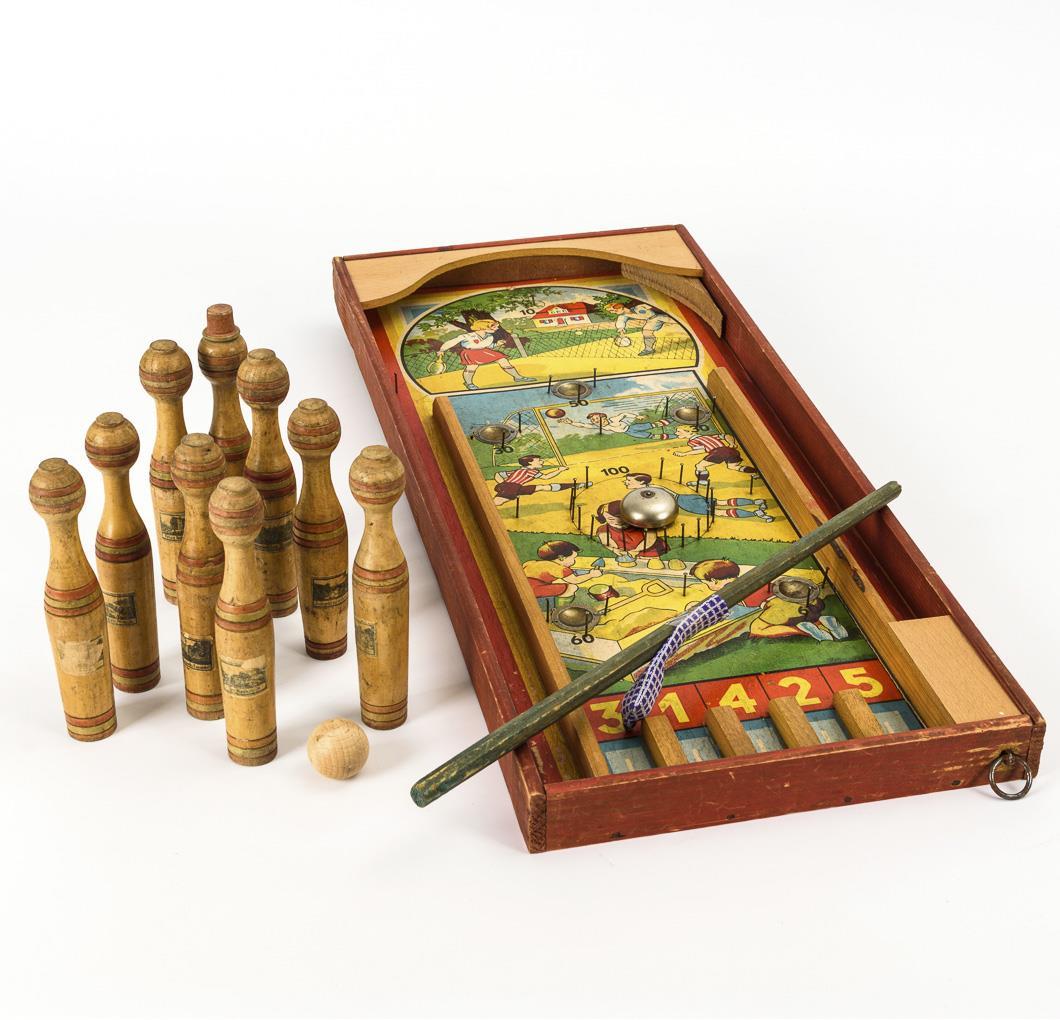 Kegelspiel um 1890, mit gedrechselten Kegeln und kleinen lithografierten Ansichten aus dem Riesengebirge, Kugel ergänzt. / Flipper mit farbig lithografierten Sportmotiven, wohl 1930er Jahre. Altersspuren.