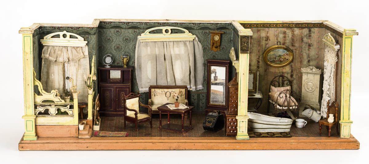 2-Raum-Gehäuse mit kleinem Podest, Zwischentür und 3 verglasten Flügelfenstern mit originalen Zinngriffen. Eingerichtet als Stube mit 5 Jugendstil-Möbelchen, Keramikofen, Blechtisch etc. und als Schlafzimmer mit Metallbett sowie Ofen, Waschtisch und Badewanne aus Blech. Bespielt, Altersspuren, Tapeten mit Wasserschaden.