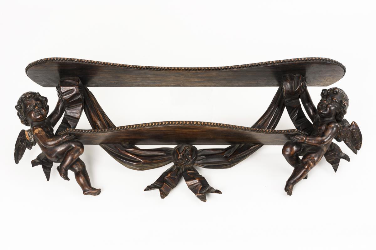 2 geschwungene Regalbretter mit Perlrändern, die von einem Paar vollplastischer Putten sowie einer Girlande gehalten werden. 1 Flügel lose anbei, sonst kaum Fehlstellen, einige Klebestellen und Alters-/Gebrauchsspuren.