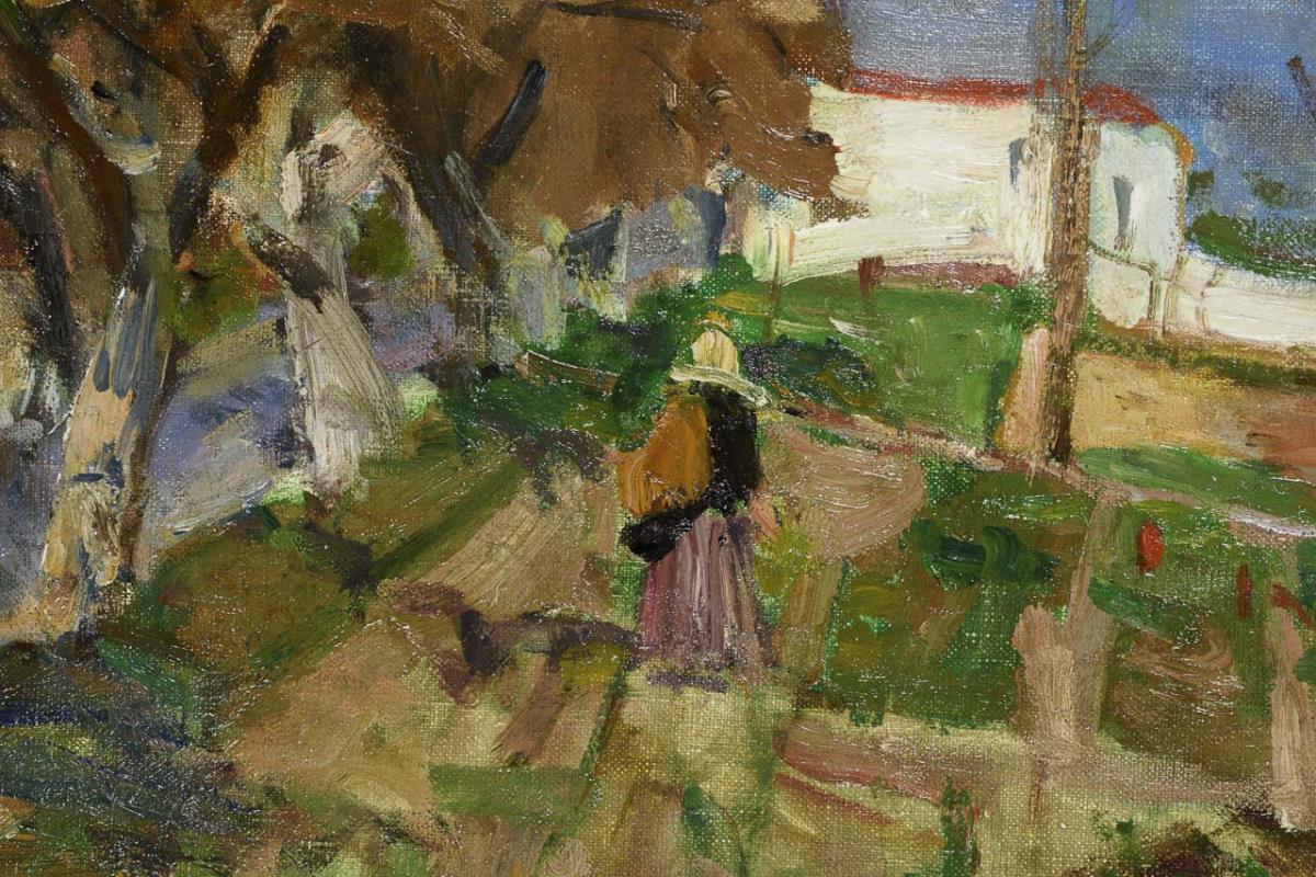 Spätimpressionistisch gemalte Dorflandschaft mit Staffagefigur auf Feldern im Sonnenschein.
