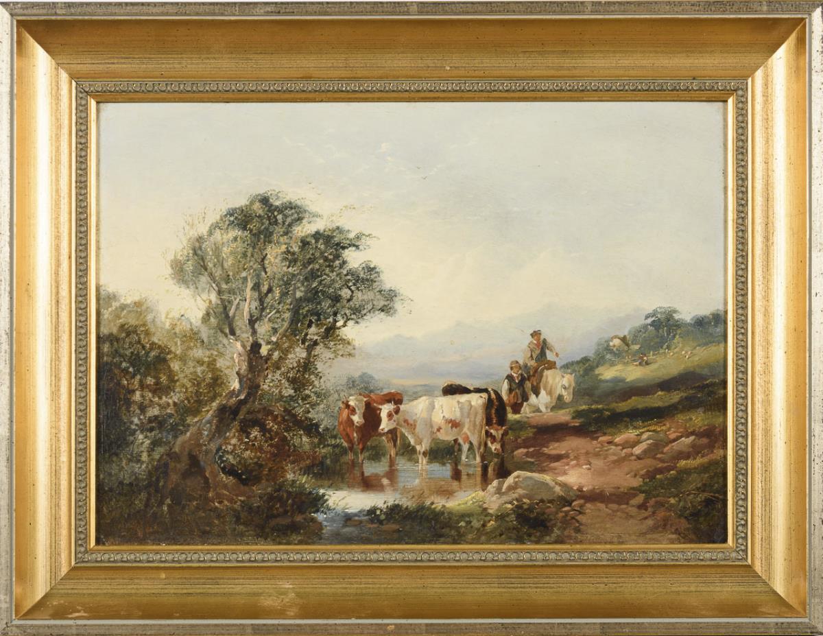 Bergige Landschaft mit Bauernvolk und den Tieren am Wasser.