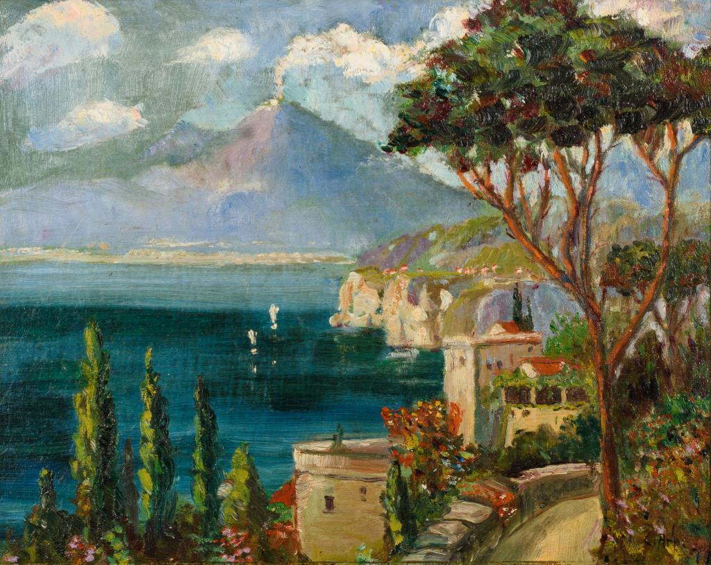 Sonniger Blick entlang der Küste nahe Neapel mit dem rauchenden Vesuv im Hintergrund.