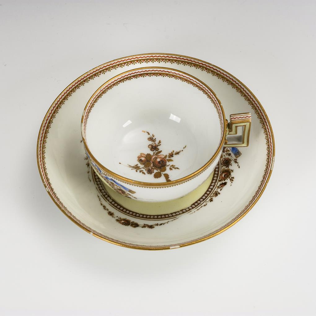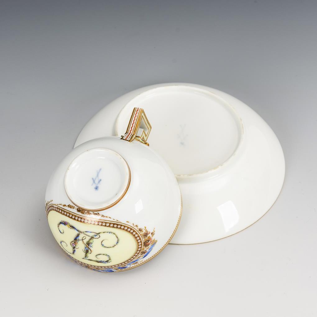 Polychrom bemalt, goldstaffiert. H Tasse 5 cm, Ø originale Untertasse 13,5 cm.