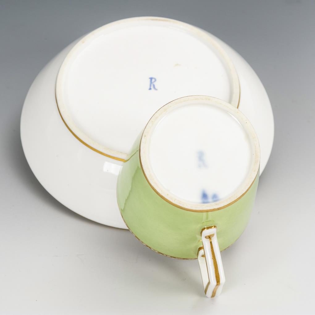 Konische Tasse mit gewinkeltem Henkel. Apfelgrüner Fond und Goldbordüre. Schauseitig ein Medaillon mit der aus einer Blütengirlande geformten Initiale "L", im Spiegel der Untertasse ein Rosenbukett. MInimaler Goldabrieb am Tassenrand.