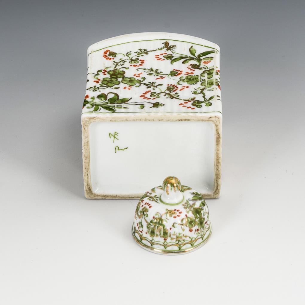 Rechteckige Teedose mit gebrochen gerippter Wandung und Knaufdeckel. Partiell berieben.