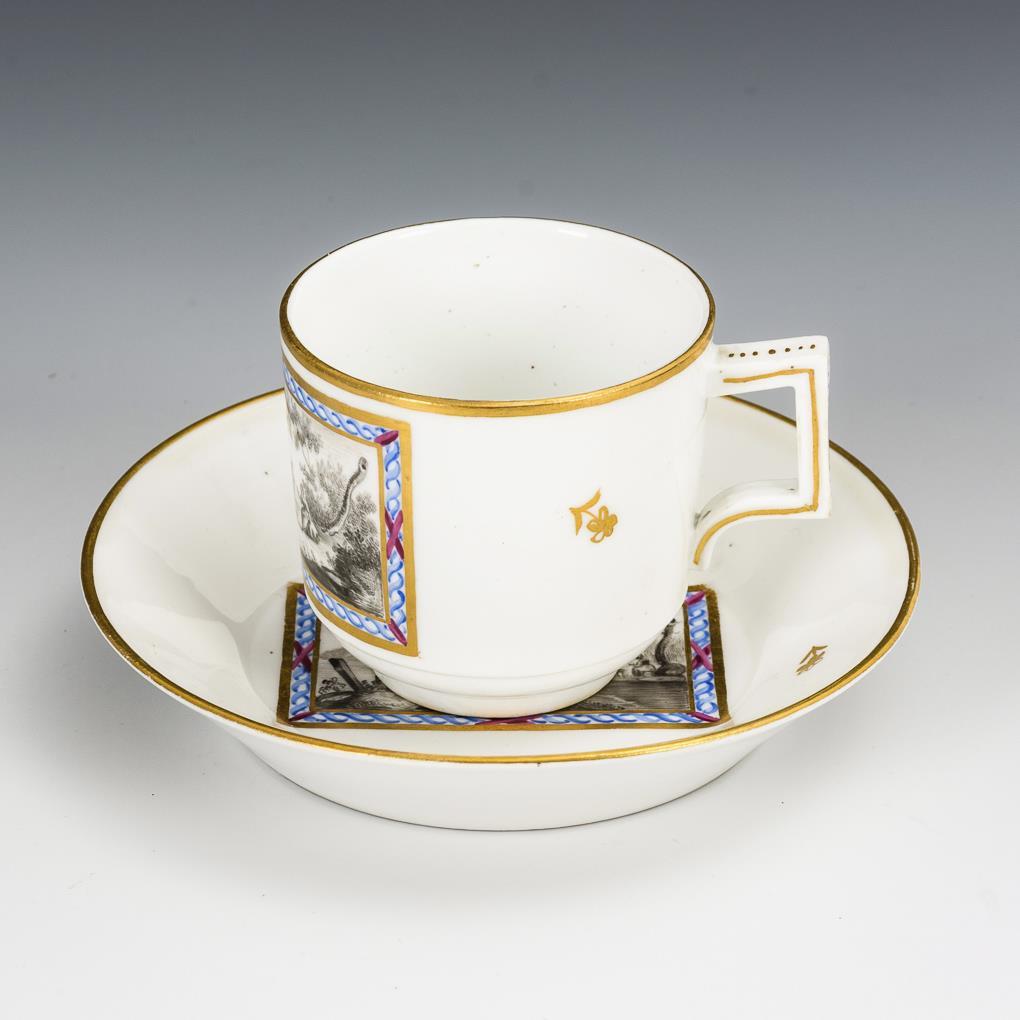 Grisaillemalerei, Goldstaffage. H Tasse 6 cm, Ø originale Untertasse 13 cm.