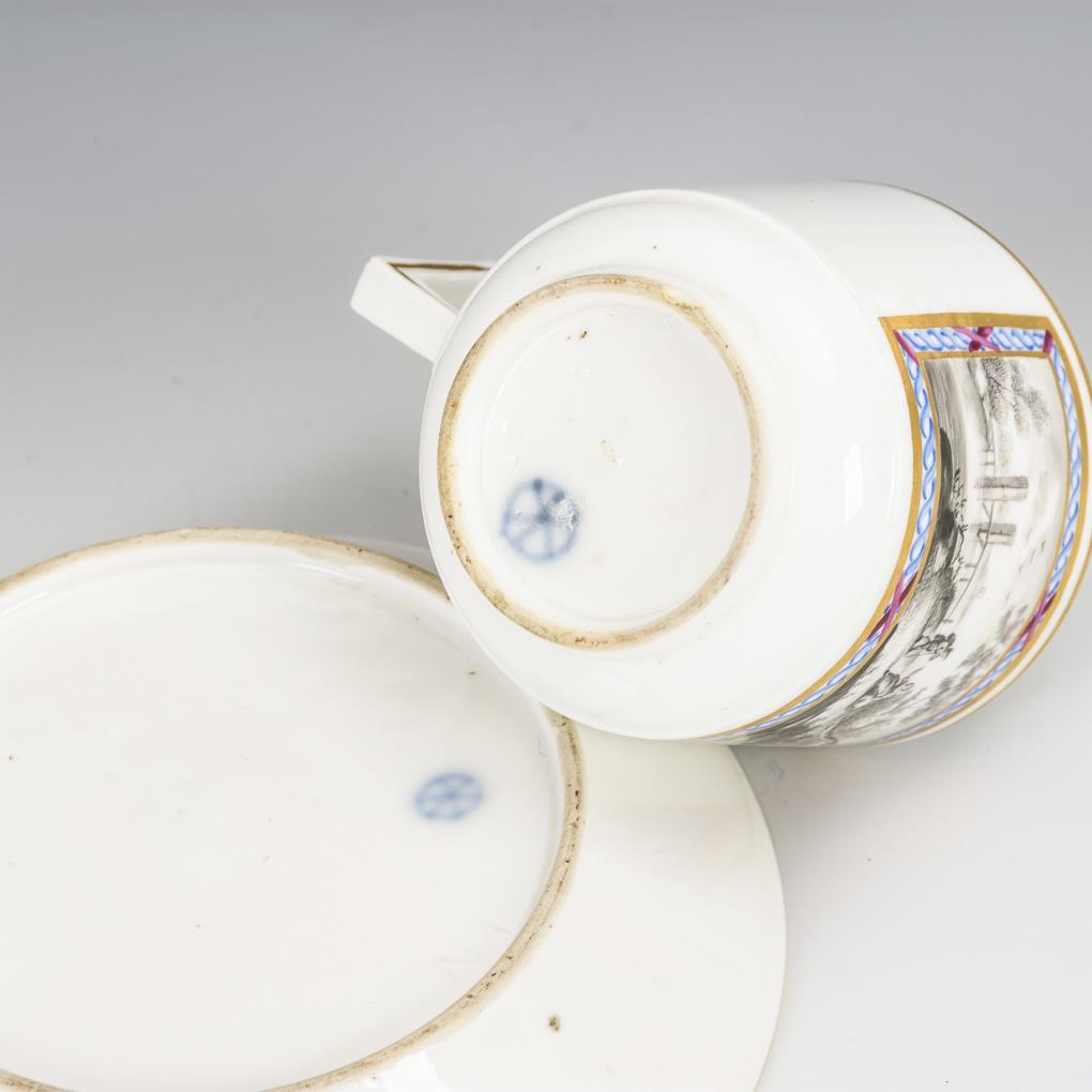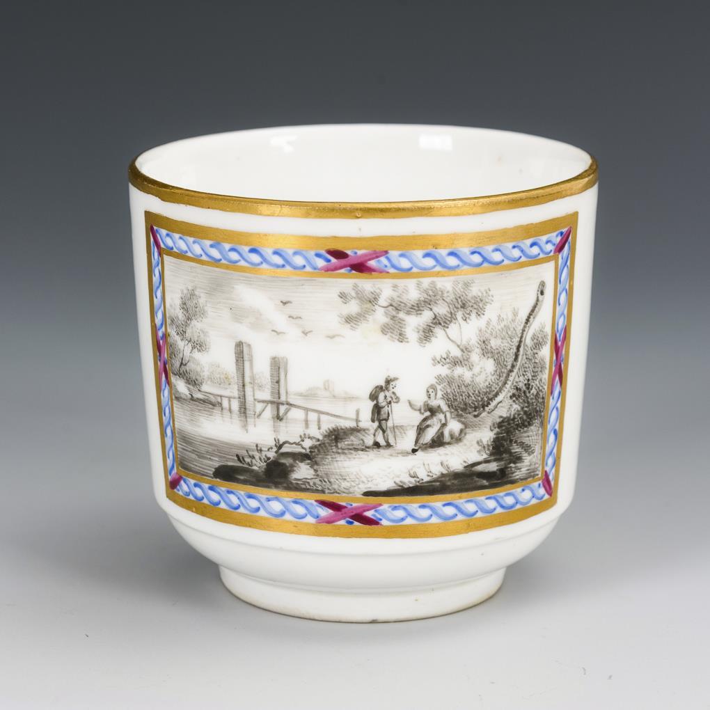 Zylindrische Tasse mit eingezogenem Stand und gewinkeltem Henkel. Schauseitig sowie im Spiegel der Untertasse eine Rechteckkartusche mit der Darstellung von Landschaften. Ascheanflug im Tasseninneren, kleine Bestoßung am Standring der Tasse.