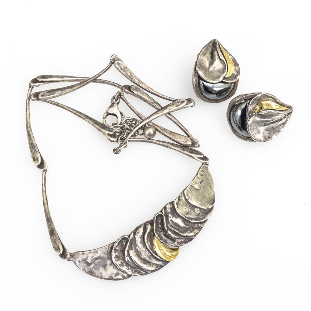 Silber 925 gestempelt. Gelbgold 585 geprüft. Collier L 44-48 cm. Ohrklipp 2 x 2,5 cm. 47,6 g.