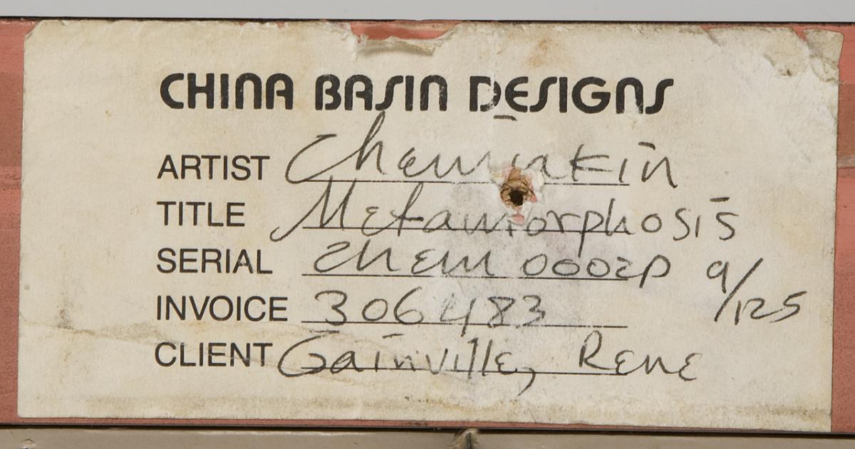 Nummeriert: 9/125, schwarzes Passepartout, verglaster geschwärzter Rahmen mit Goldleiste. Rückseitig Klebezettel: China Basin Designs…Client René Gainville (1941 Budapest - 2014 Paris), Autor, Regisseur.