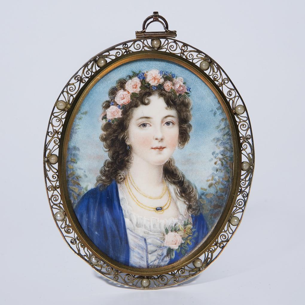 Portrait-Miniatur: Mädchen mit Blütenkranz.