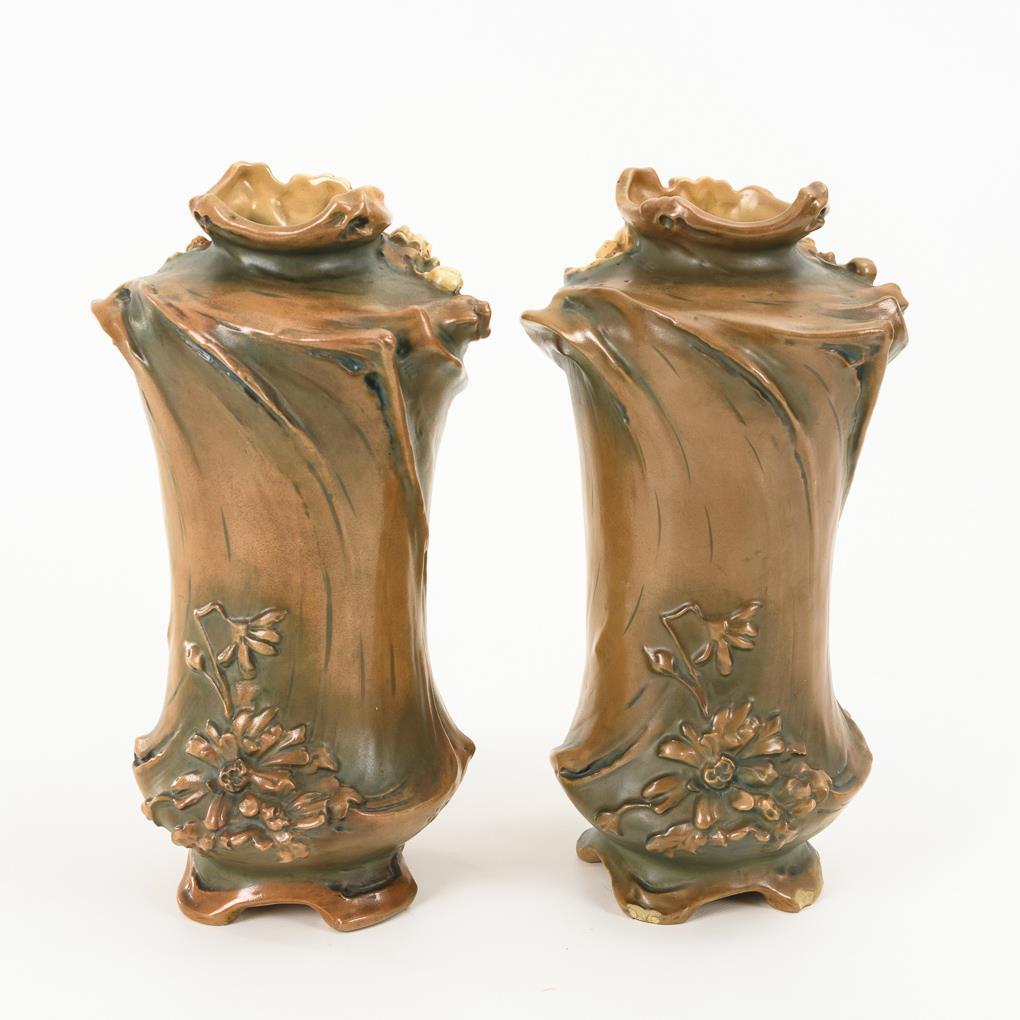 Zylindrisches Vasenpaar mit blütenreliefierter Wandung im typischen floralen Jugendstil. 1 Vase mit leichten Bestoßungen am Fuß.