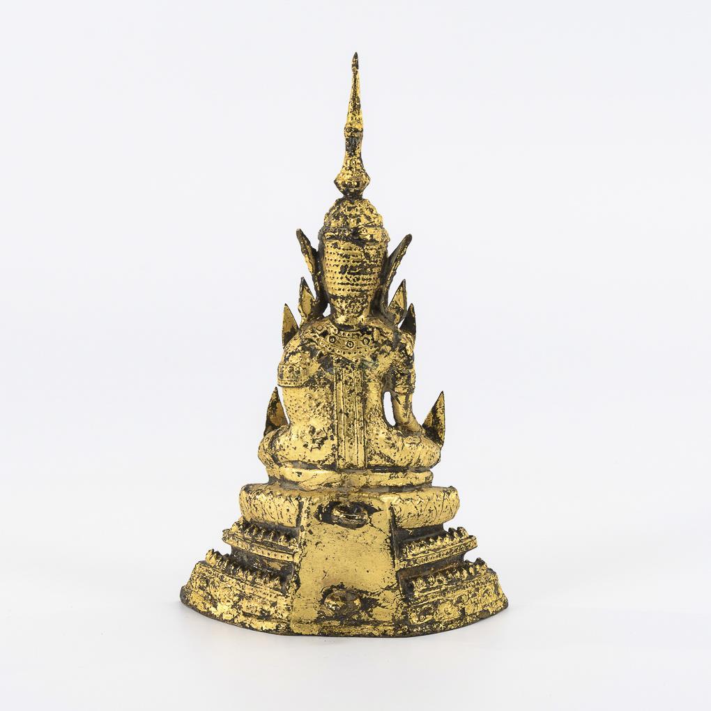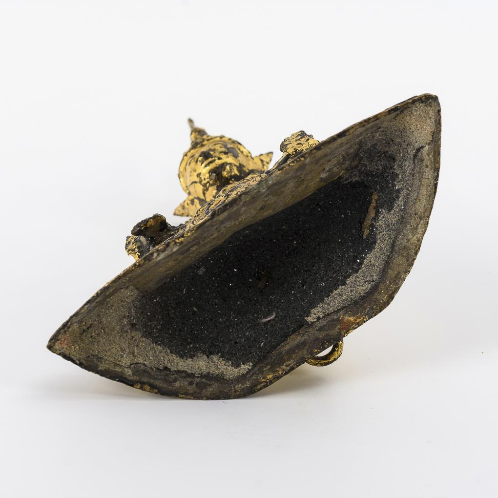 Buddha mit der Geste der Gabengewährung. Vergoldung berieben, Sockel hohl, rückseitig zwei Ösen.