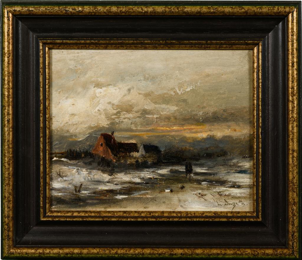 Vereister Fluss nahe Gehöft mit Staffagefiguren.