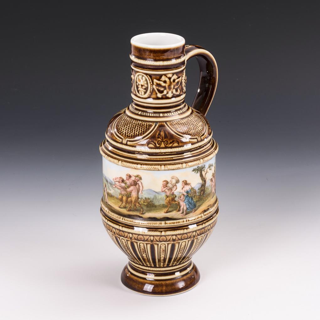 Unterglasurbrauner, gemusterter Fond, umlaufend ein polychrom gemaltes Bacchantenmotiv. H 25,5 cm.