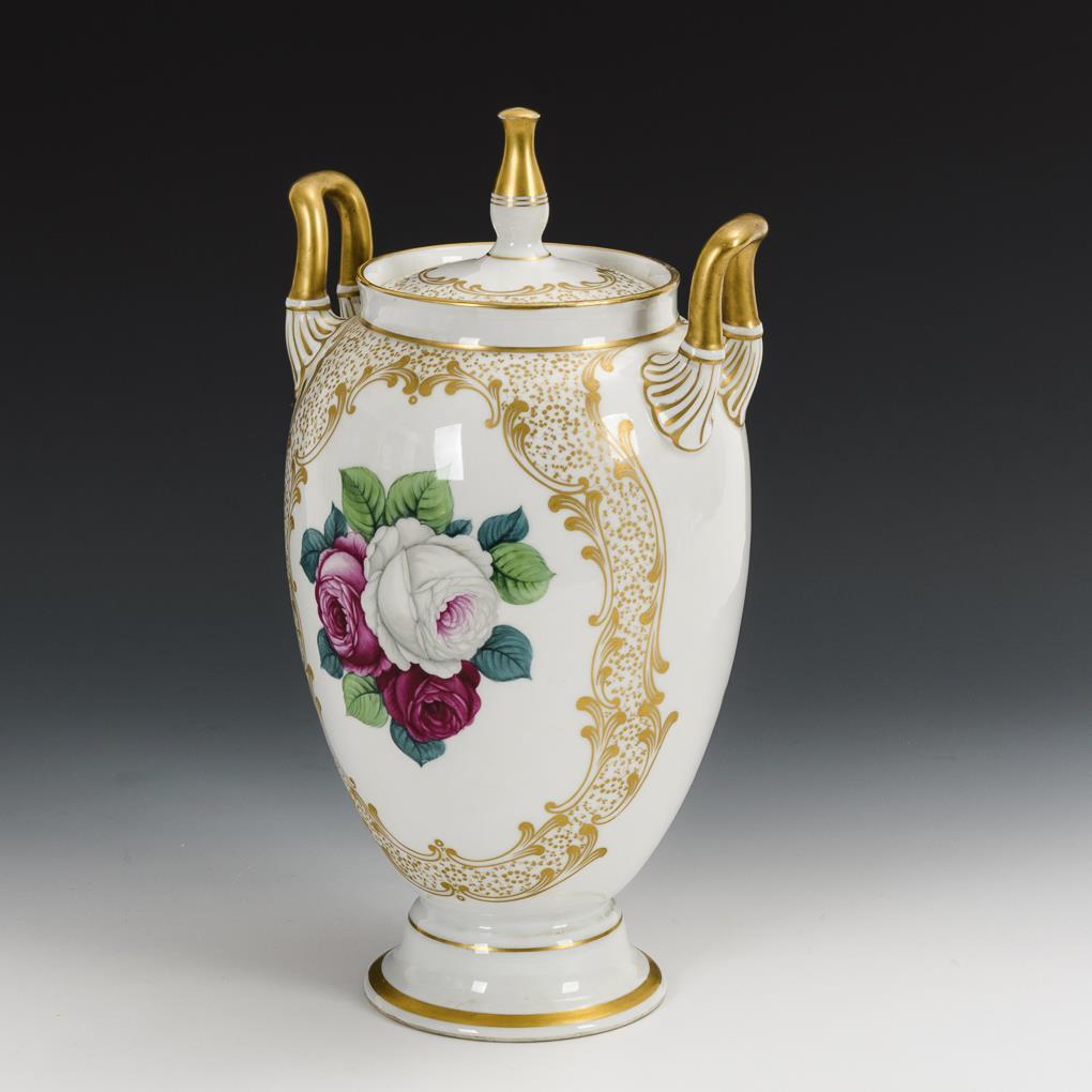 Ovoide Vase mit zwei kleinen Henkeln und Knaufdeckel. Beidseitig ein fein gemaltes Blumenbukett aus weißen und purpurfarbenen Rosen. Minimaler Goldabrieb am Rand.