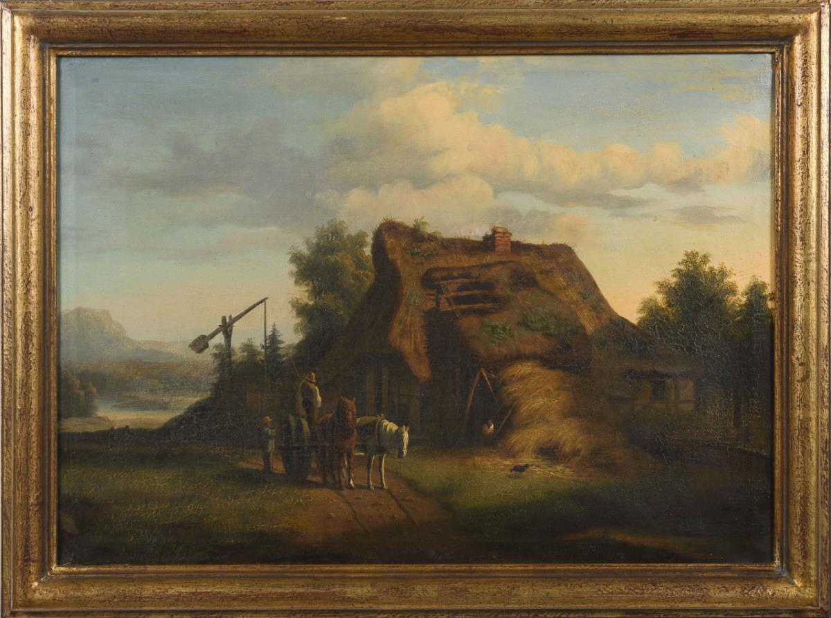 Undeutlich signiert: Pferdegespann vor Bauernkate