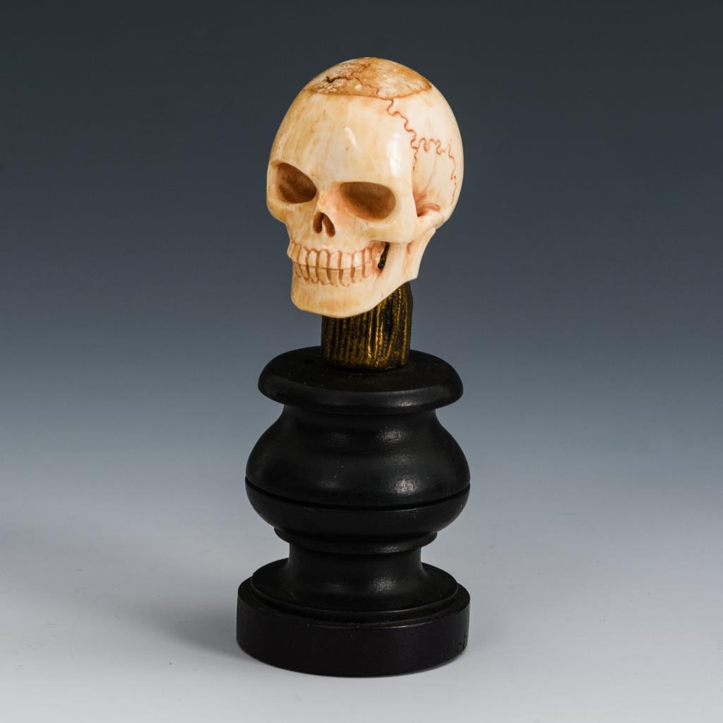 Geschnitzter Totenschädel auf gedrechseltem Sockel. Bein leicht haarrissig, Ausfüllung an der Schädelkalotte angelaufen.