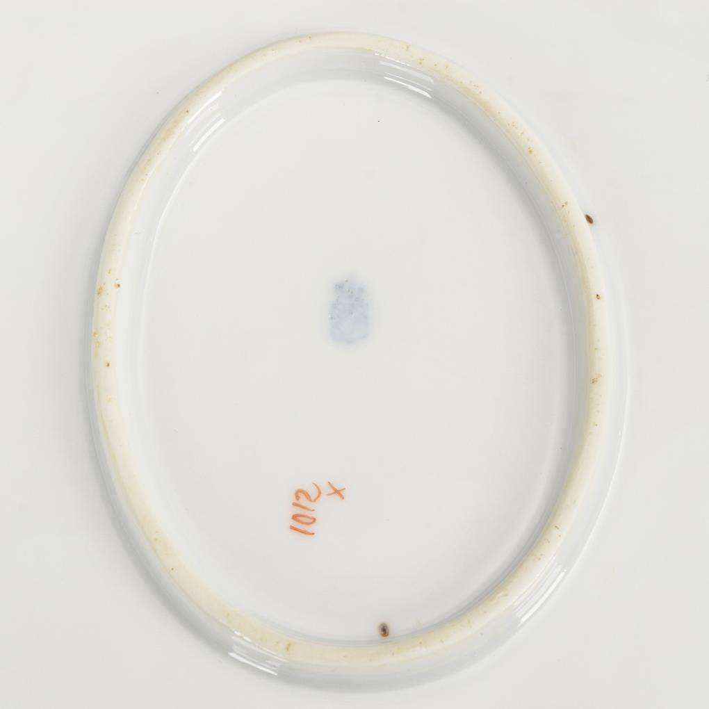 Platte mit zwei Rocaillehandhaben, im Spiegel ein Blumenbukett. Minimaler Goldabrieb.