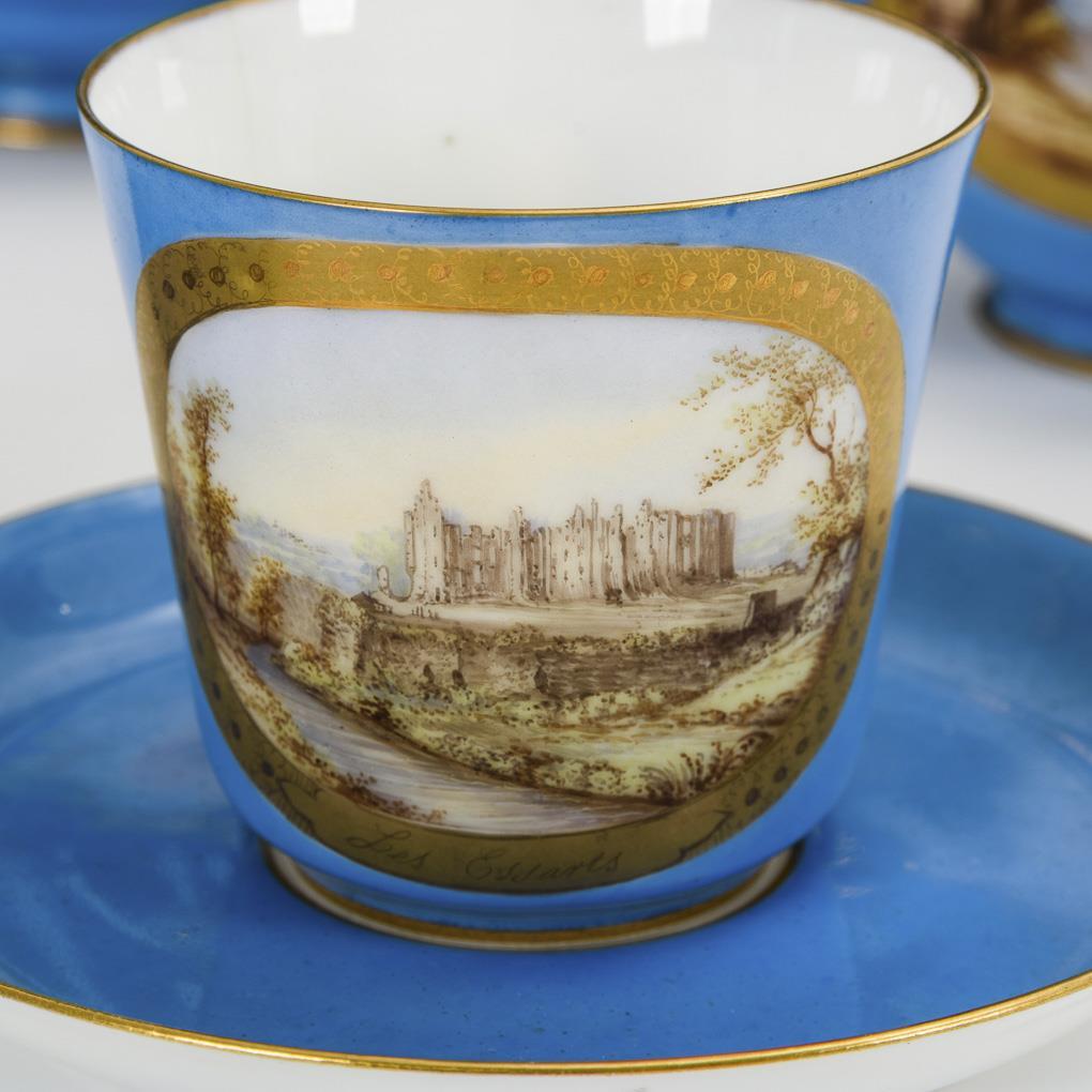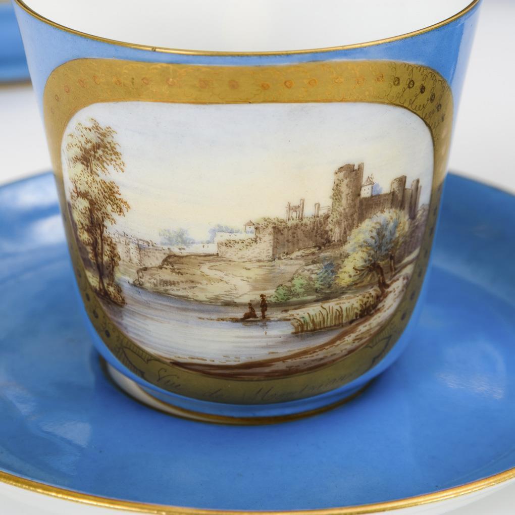7 Teile. Hellblauer Fond, in Medaillons die Darstellung verschiedener, auf dem goldgravierten Rahmen bezeichneter französischer Ansichten (u.a. Argenton-Château, Beaupréau, Clisson, Montaigu). Kaffeekanne (H 17 cm), Milchkännchen, Zuckerdose, 2 Tassen und 2 Untertassen. Haarrissspinne in der Wandung des Milchkännchens und 1 Tasse, Bestoßung am Rand des Zuckerdosendeckels, Gold berieben.