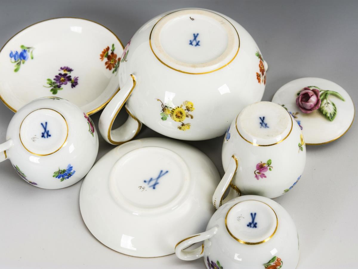 8 Teile. Glatte Form mit Streublümchenmalerei. Kaffeekännchen (H 7,5 cm), Teekännchen (H 5 cm), Milchkännchen, Zuckerdöschen, 2 Tässchen und 2 Untertässchen. 1x Rosenknauf bestoßen, 2 Bestoßungen am Innenrand des Teekännchens.