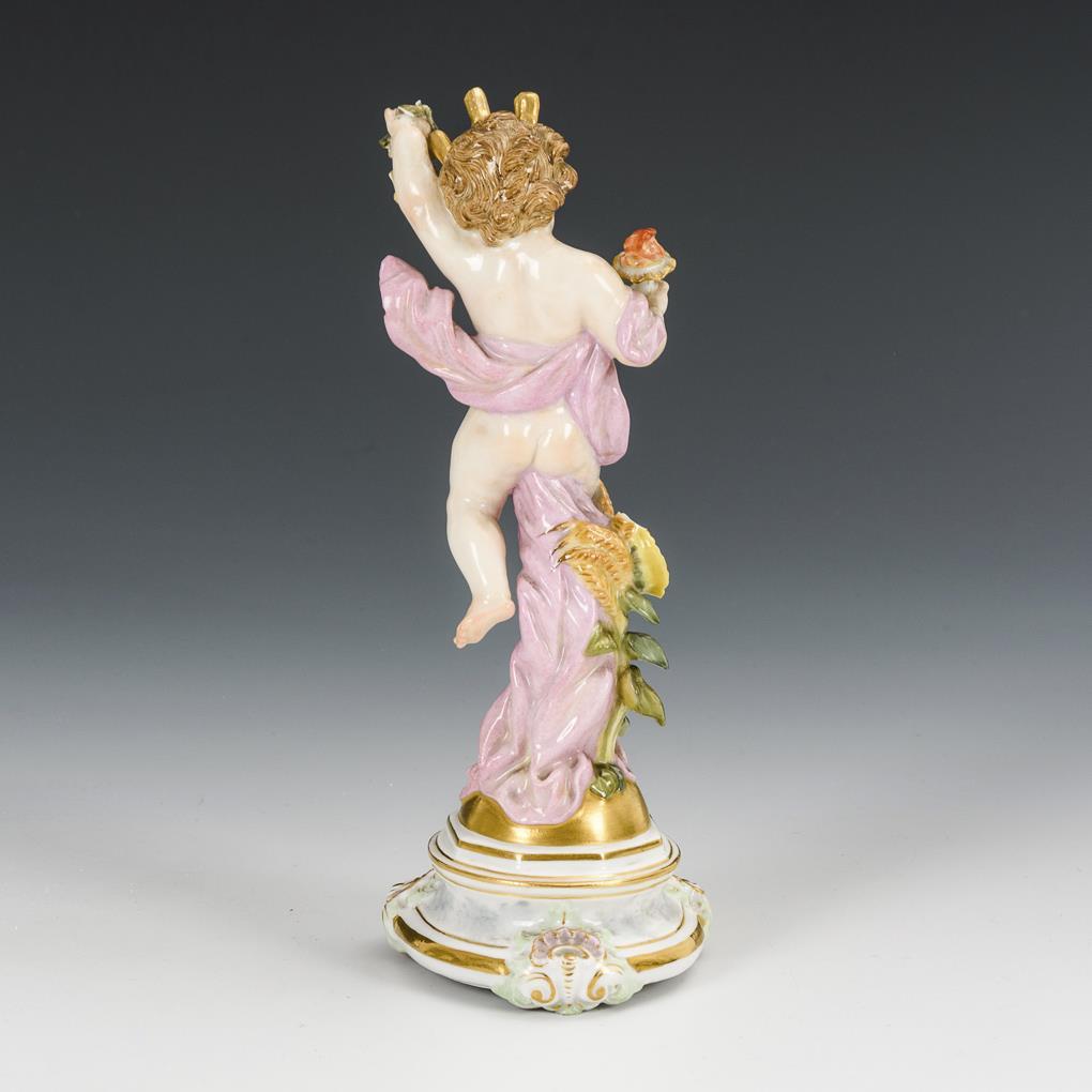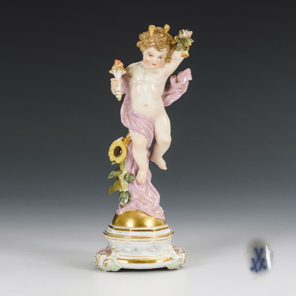 Auf einem Rundsockel stehender Putto mit Fackel und Strahlenkranz im Haar. 1 Ähre und 2 Blätter bestoßen.