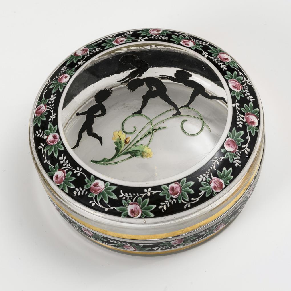 Zylindrische Dose. Auf dem Deckel in der Art eines Scherenschnittes die Darstellung von vier spielenden Kindern, auf der Wandung und am Deckelrand Röschenmalerei auf schwarzem Fondband. Minimale Randbestoßungen am Deckel- und Schalenrand.