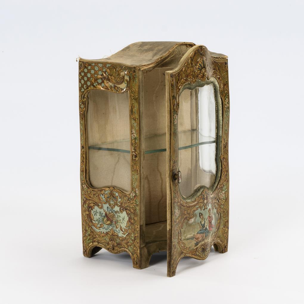 Gebauchtes, metallbeschlagenes Vitrinen-Schränkchen, mit farbig lithografiertem Rokoko-Dekor. Altersspuren, kleine Defekte.