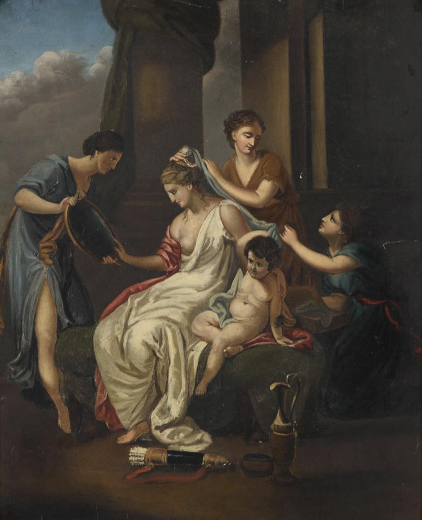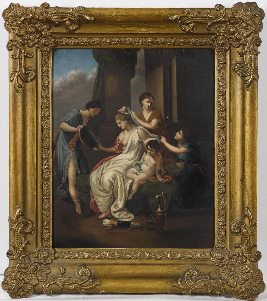 Die Göttin beim Blick in den Spiegel, daneben der Amorknabe und die Diener. Leichte Altersspuren.
