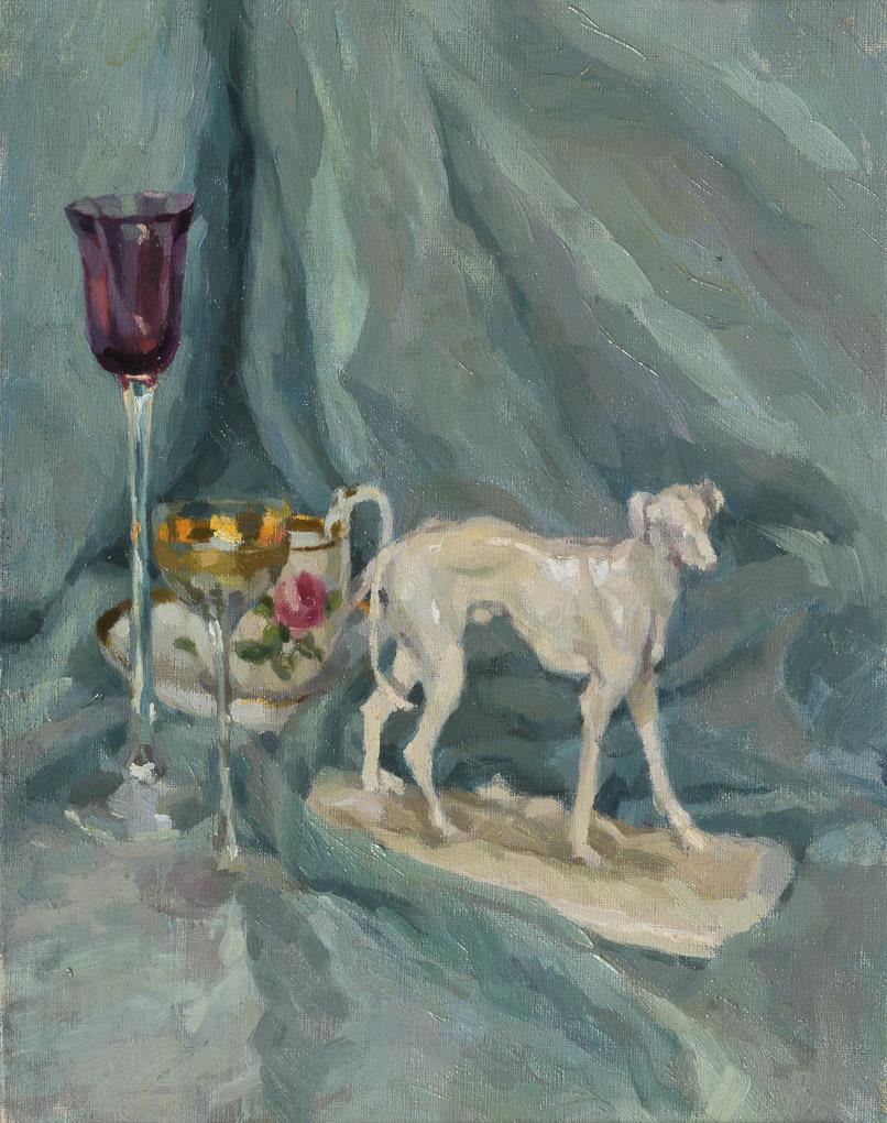 Jagdhund aus Porzellan neben den Gläsern und einer Tasse mit Blumenmalerei.