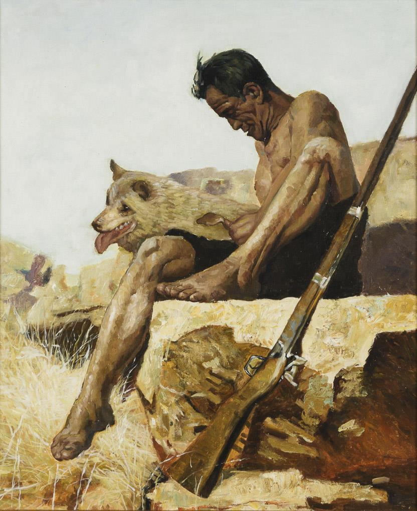 Der Jäger im hellen Sonnenlicht auf einem Felsen mit dem Gewehr und dem hechelnden Hund.