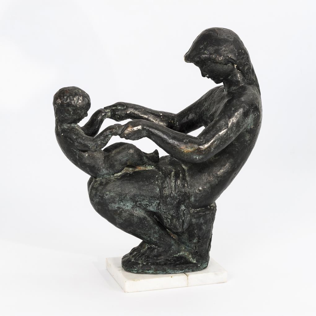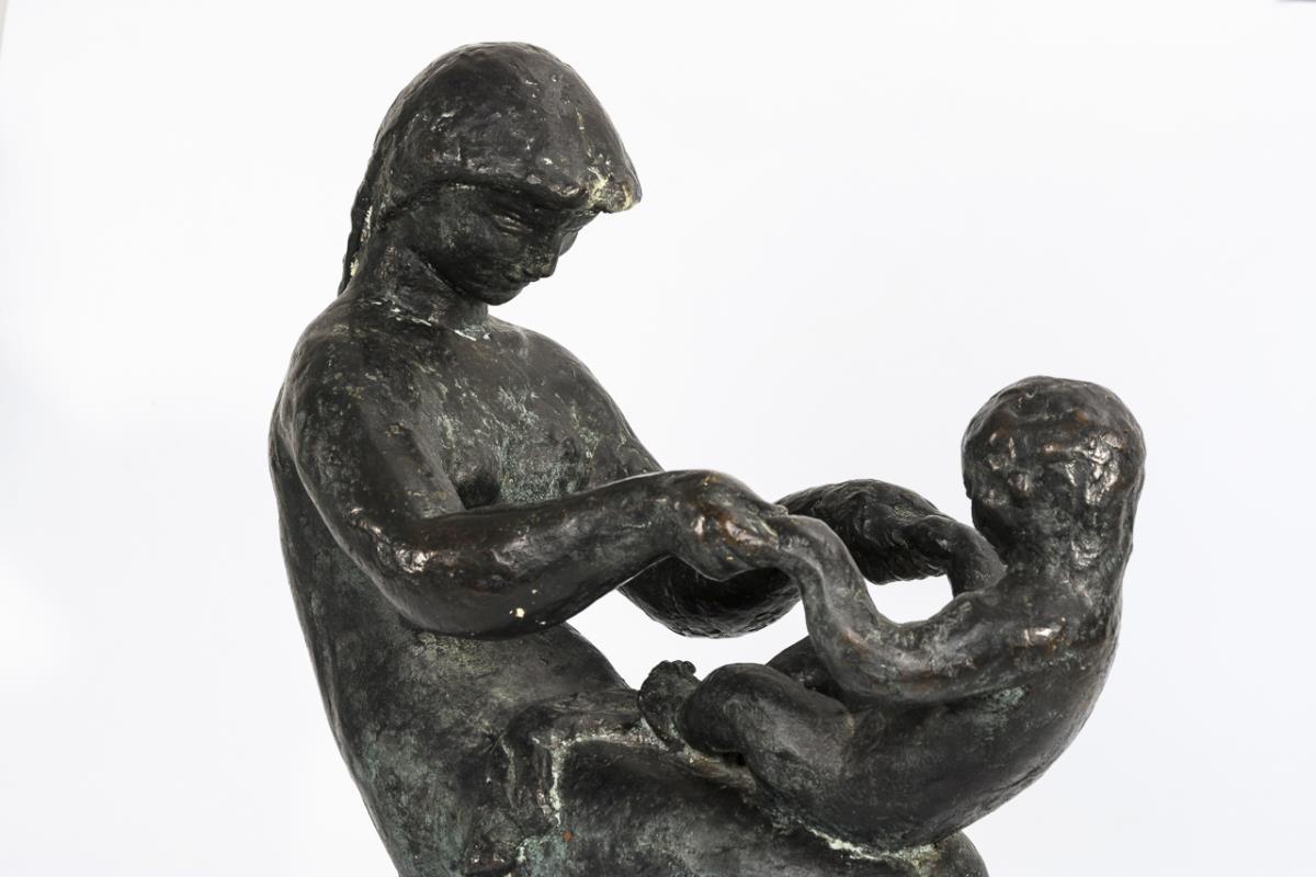 Aktgruppe mit reitendem Kind auf dem Schoß der Mutter. Patina teils berieben/bestoßen, Plinthe geklebt und mit kleineren Abplatzern.