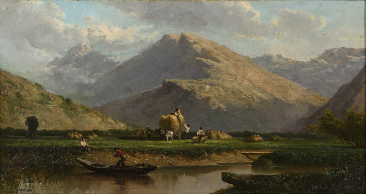 Die Bauern bei der Heuernte nahe dem Fluss vor den Bergen. Restauriert mit Hinterklebungen.