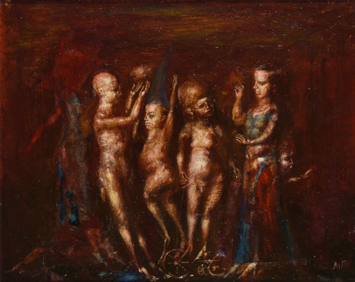 Surrealistische Szene mit nackten Personen in roter Umgebung.