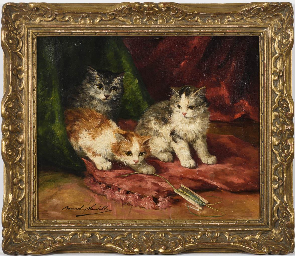 Die drei jungen Katzen beim Spielen mit dem Garn vor schweren Vorhängen. Minimale Altersspuren.