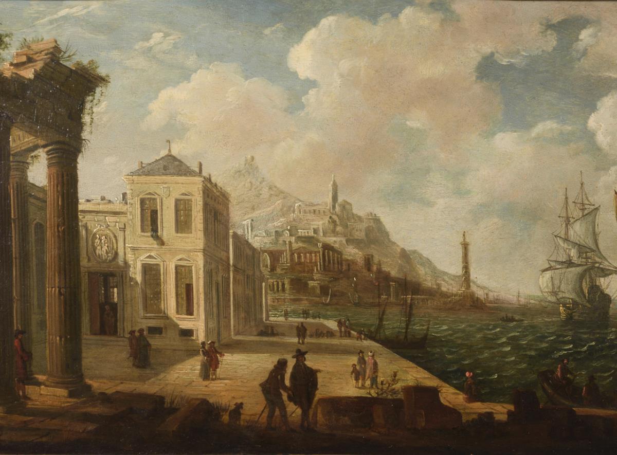 Südlicher Hafen mit viel Personenstaffage nahe dem Ufer mit den nahenden Schiffen im Sonnenschein. Retuschiert.