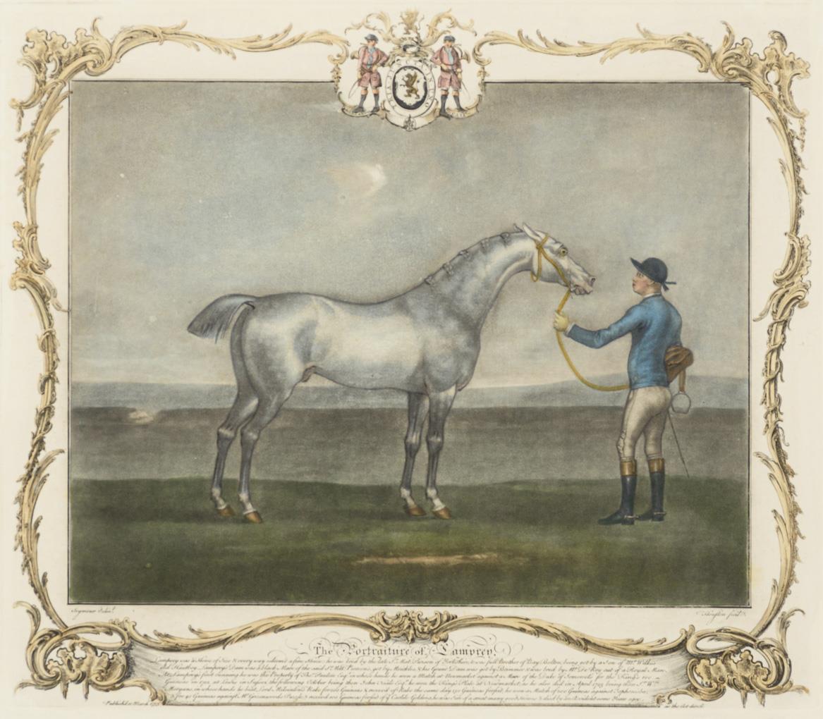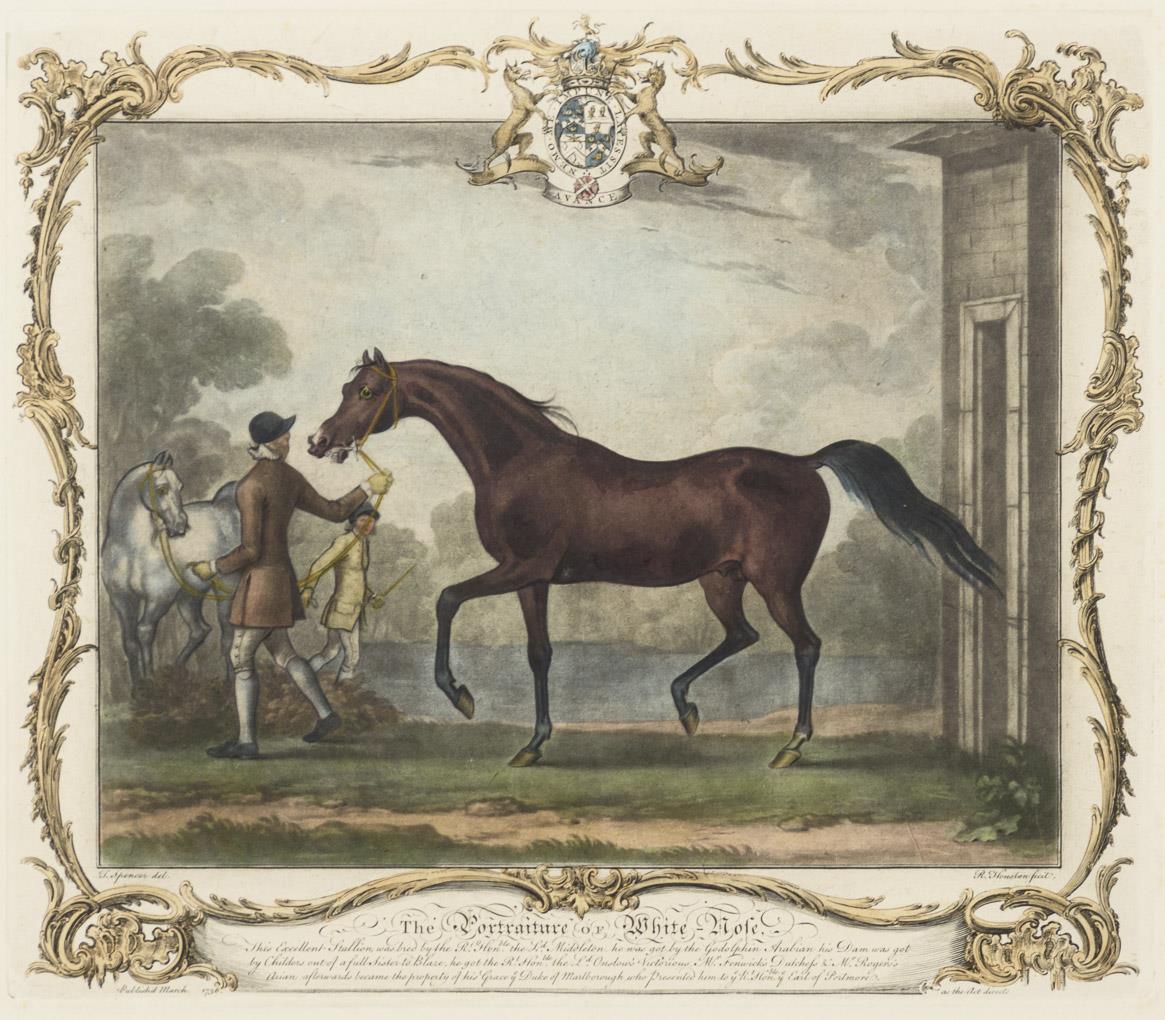 2 Reiter mit ihrem Pferd aus einer Serie des Jahres 1755, gerahmt mit Rocaillen, Textteil in englischer Sprache; nach einem Gemälde von James Seymour (1702 - 1752). Je minimal stockfleckig.