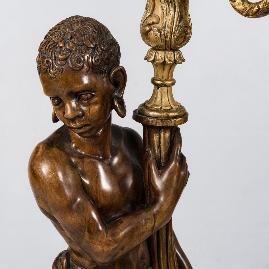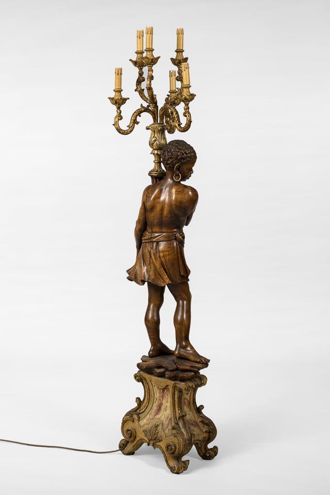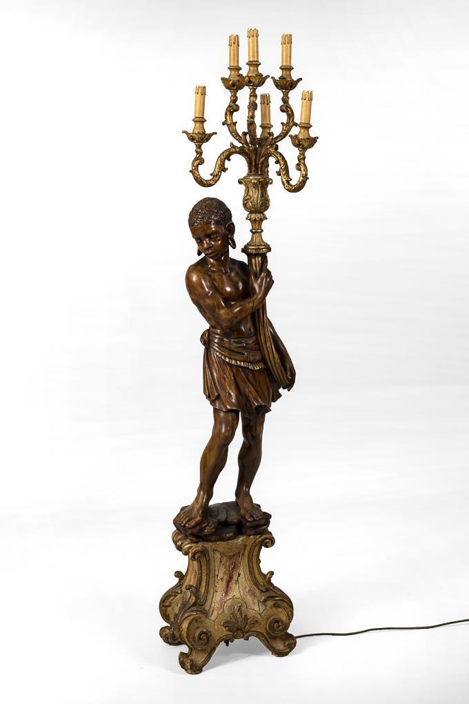 Geschnitzte Stehlampe in Form eines afrikanischen Kindes, einen 6-armigen, rocaillenverzierten Leuchter haltend, auf marmoriert gefasstem Sockel in barocker Formensprache. Alters-/Gebrauchsspuren, Trockenrisse.
