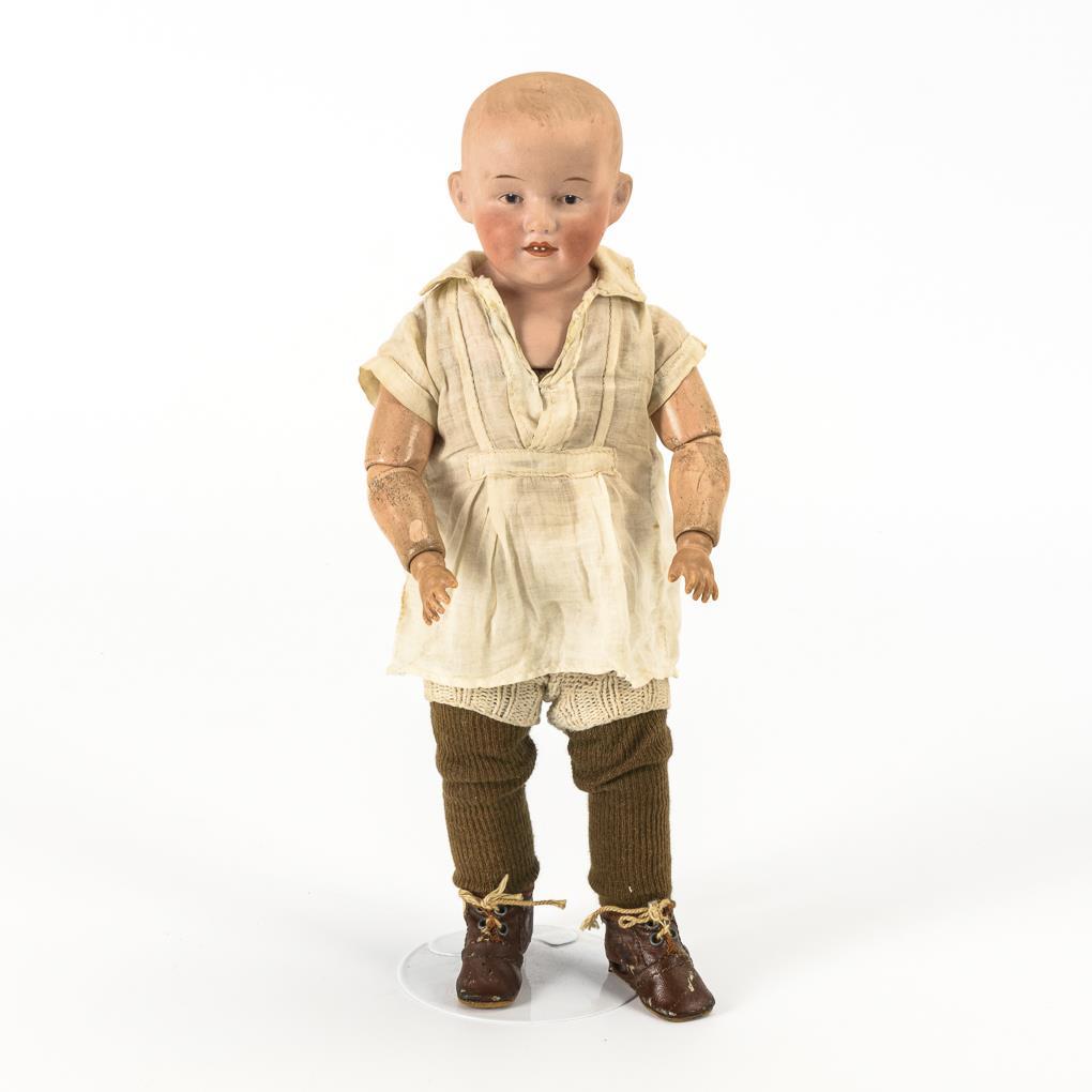 Vollkopf mit modellierten Haaren und gemalten blauen Intaglio-Augen. Wachstuchkörper mit gesplinteten Beinen, mehrteiligen Gliederarmen und Celluloidhänden. Weißes Hemdchen, festgeheftete braune Strümpfe und Schuhe. Leichte Altersspuren, Kopf ohne sichtbare Defekte.