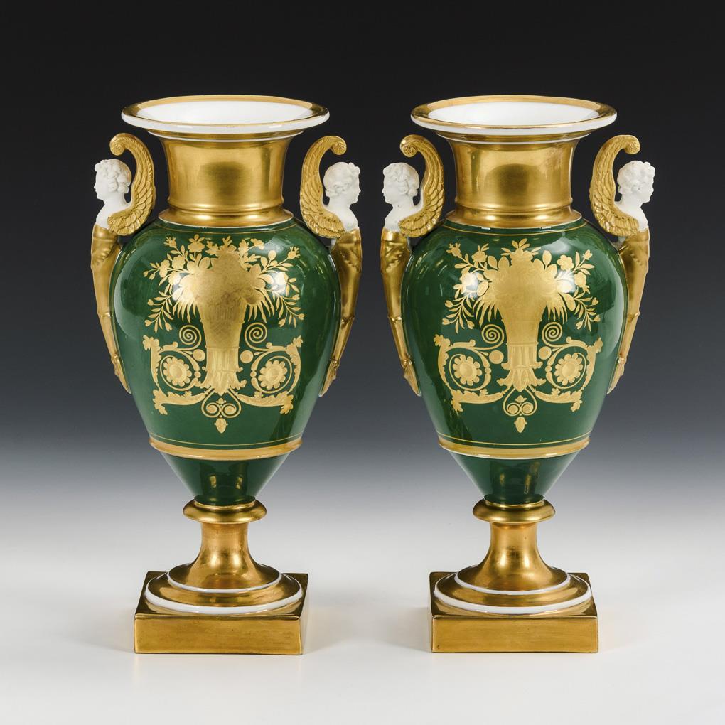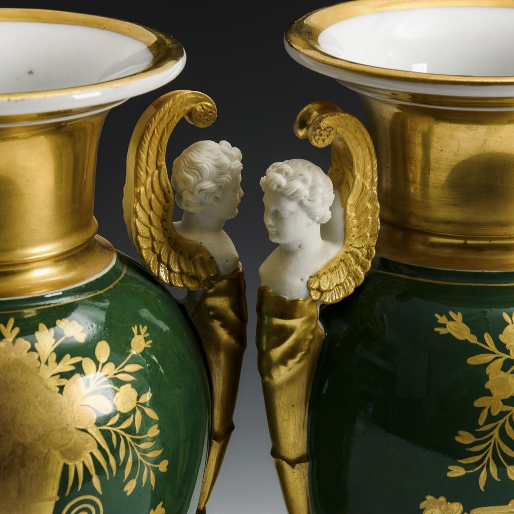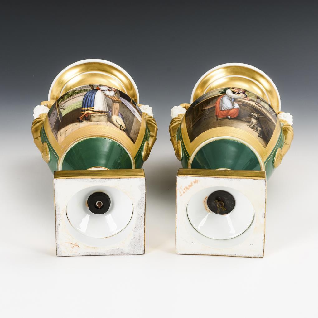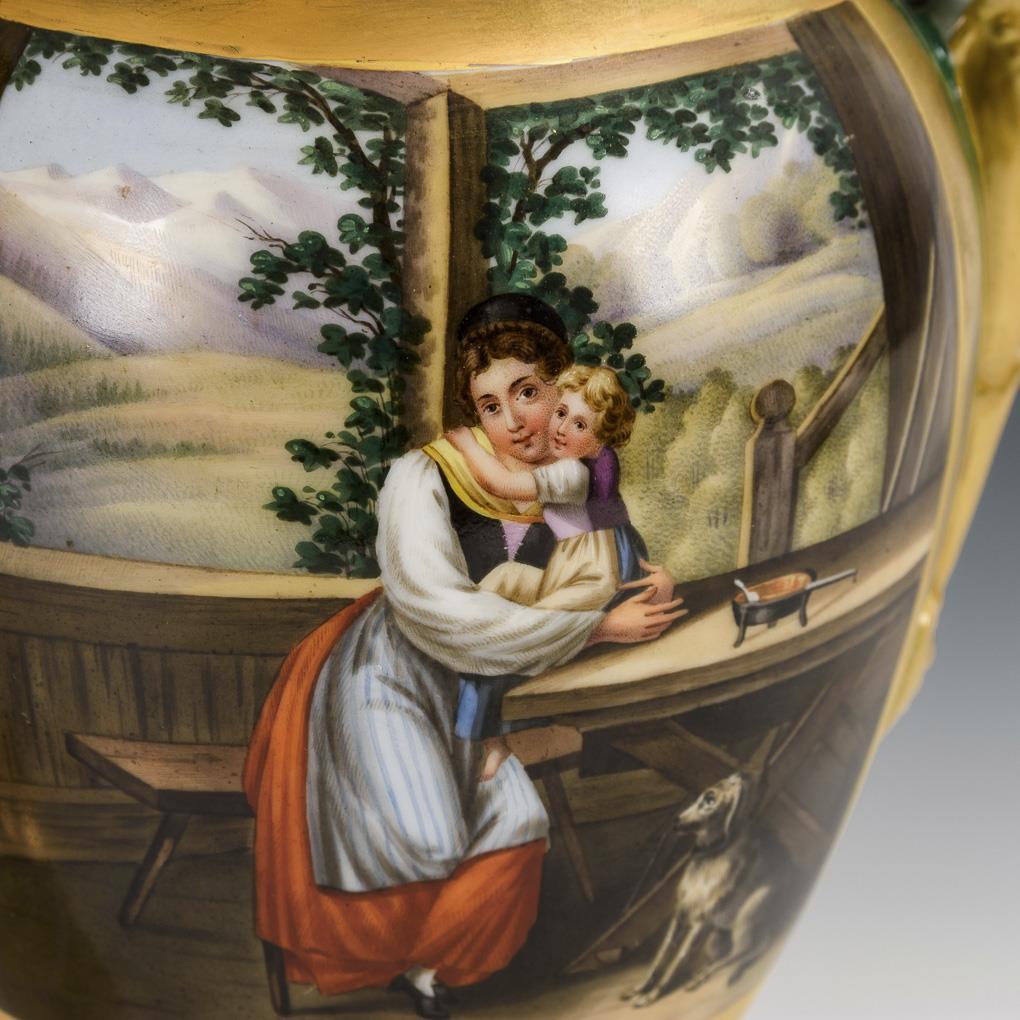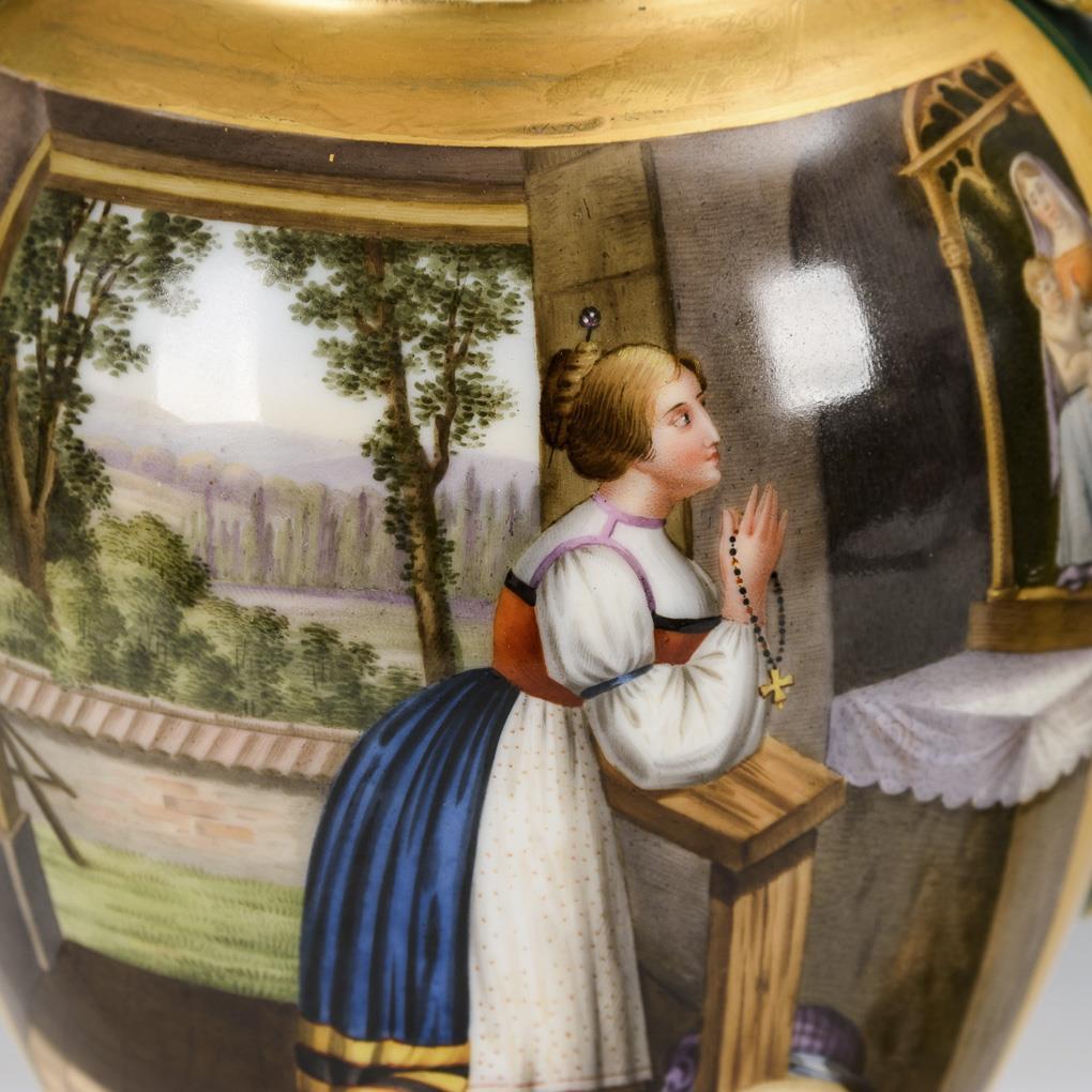 Ovoide Vasen mit Kraterhals, zwei Engelskopfhandhaben und Rundfuß, auf Quadrathplinthe. Schauseitig eine Rechteckkartusche mit den fein gemalten Darstellungen einer an einem Tisch sitzenden Mutter mit ihrer Tochter, bezeichnet "Muttertreue" bzw. einer jungen, vor einer Madonna betenden Frau, bezeichnet "Andacht". Bei beiden Korpusansatz und Wandung verso restauriert, 1x Handhaben restauriert.