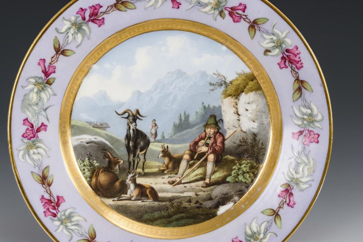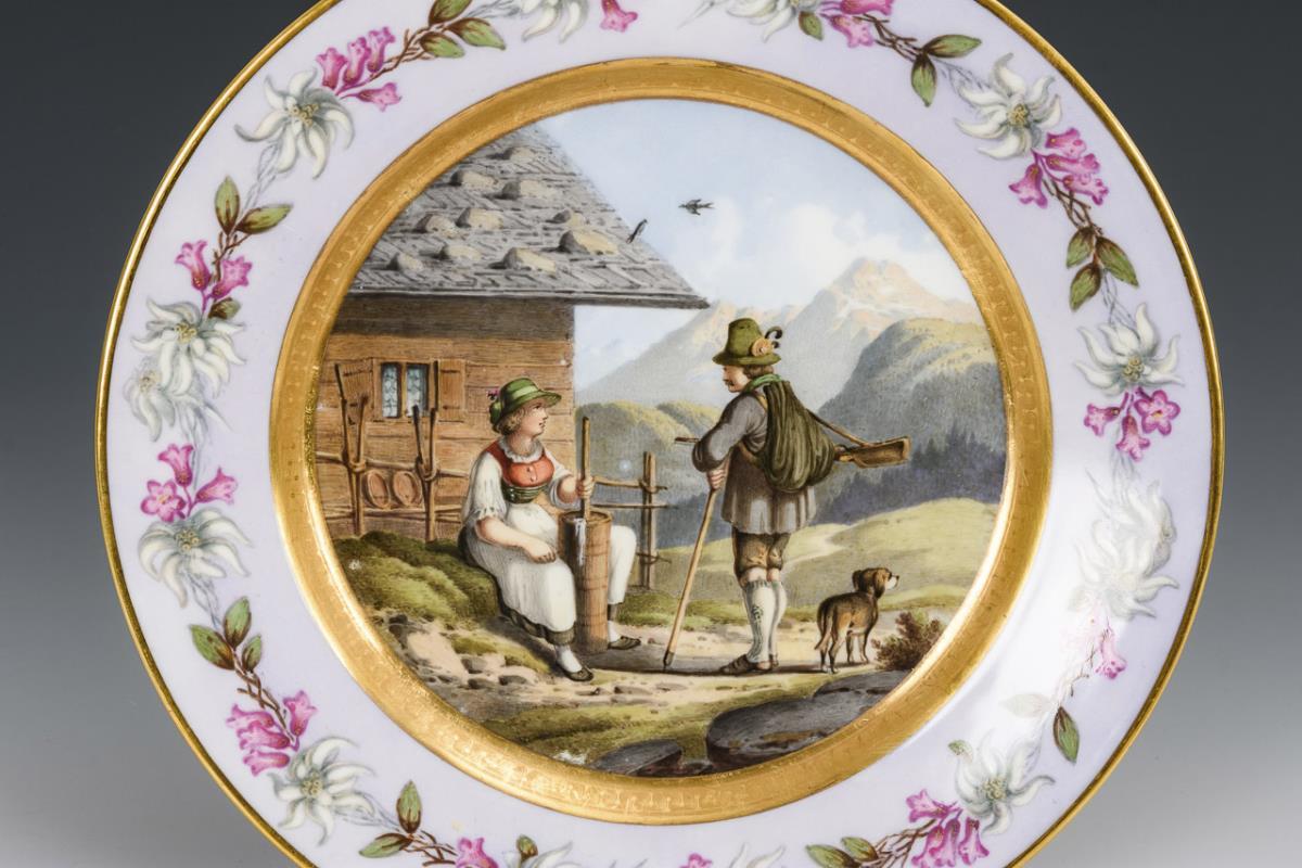 Flache Teller mit einem Blumenband mit Edelweiß auf dem violetten Fahnenfond, im Spiegel alpine Motive mit Figuren. Partiell minimaler Farb- bzw. Goldabrieb.