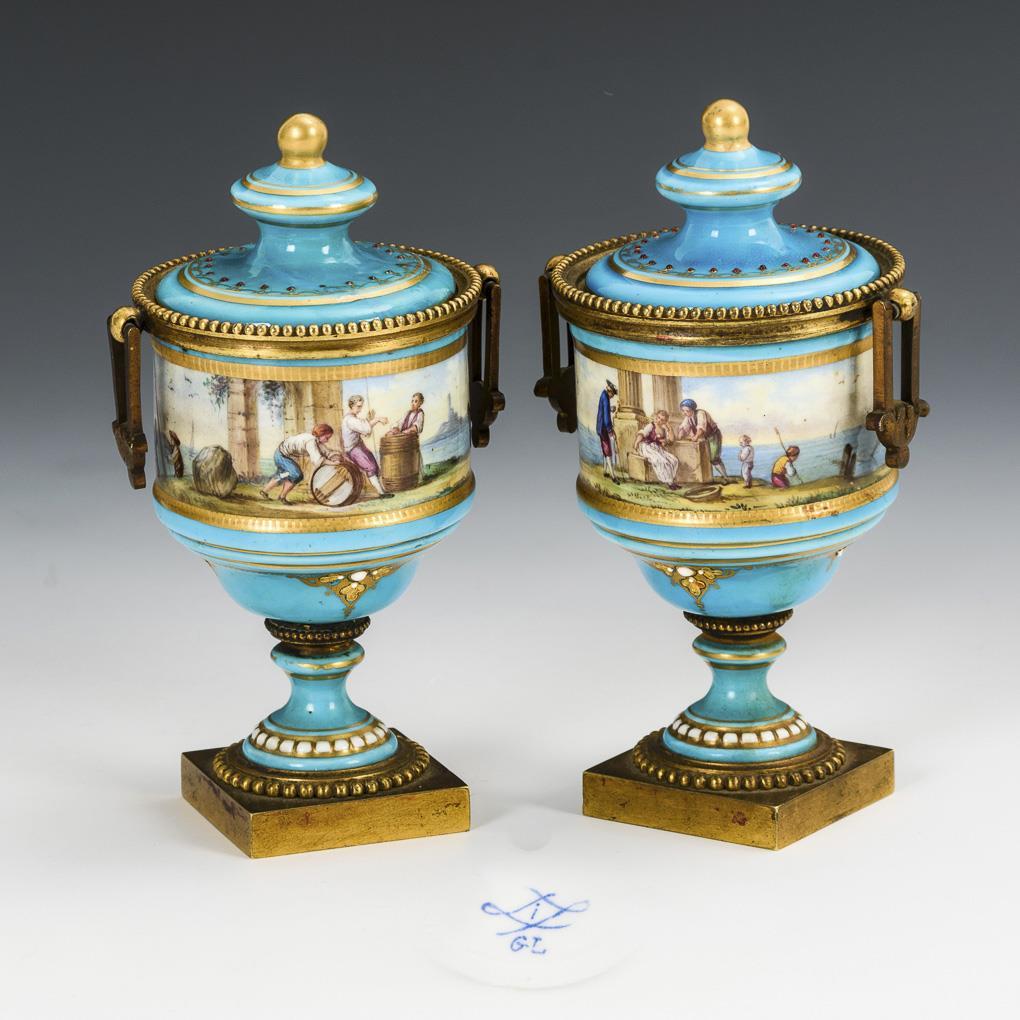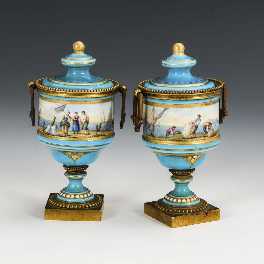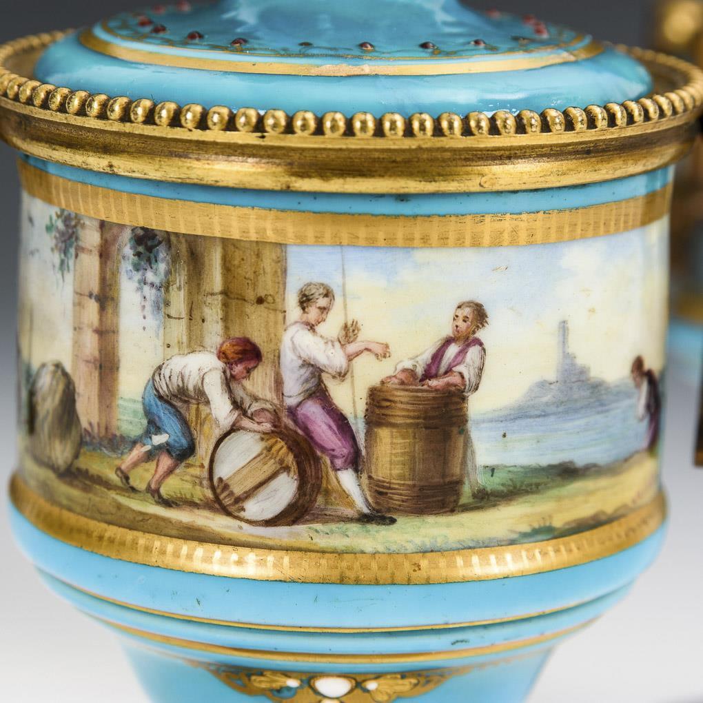 Zylindrischer Korpus mit Knaufdeckel und Bronzemontierung, Rundfuß, Bronzeplinthe. Umlaufend Kauffahrteimalerei. 1 Deckel restauriert, 1 Deckel mit Randbestoßung, einige Emailpünktchen fehlen.