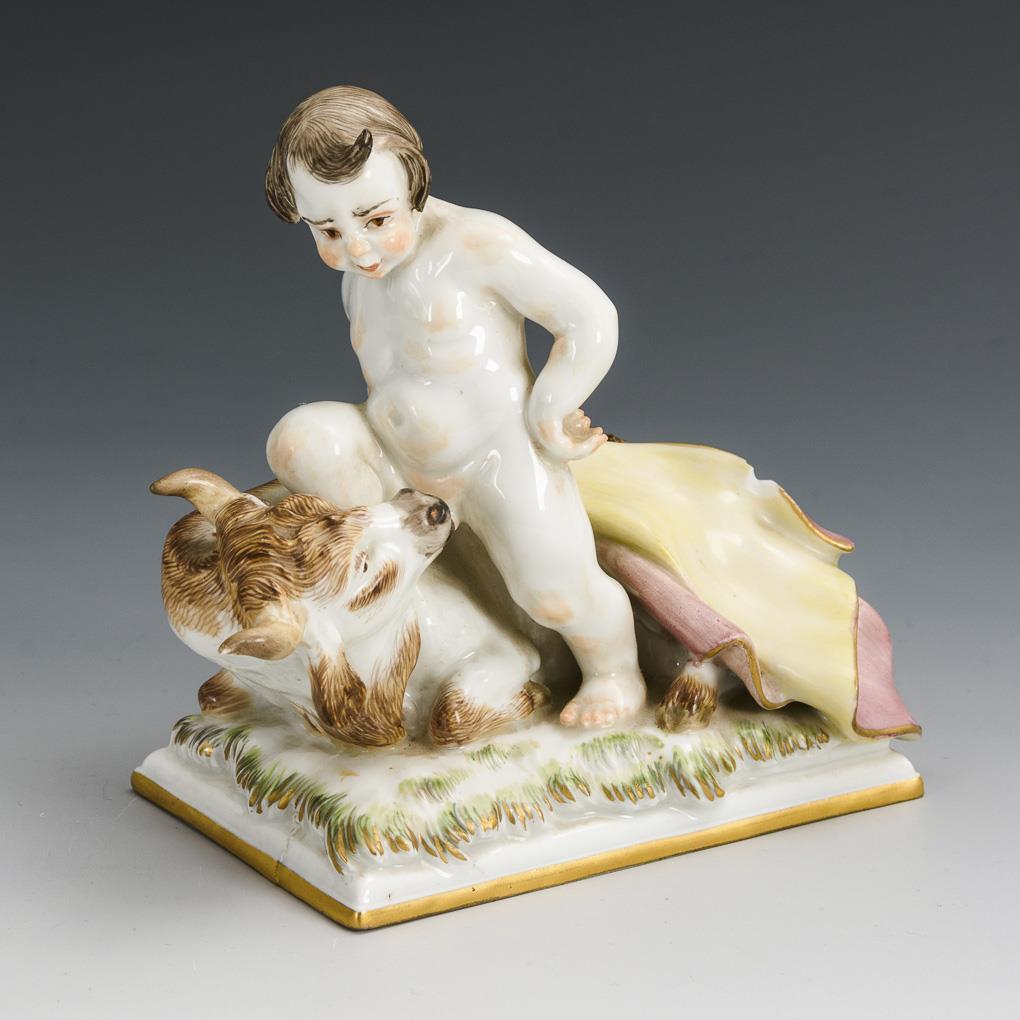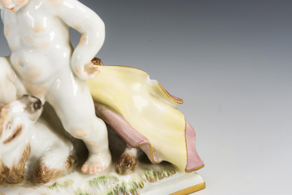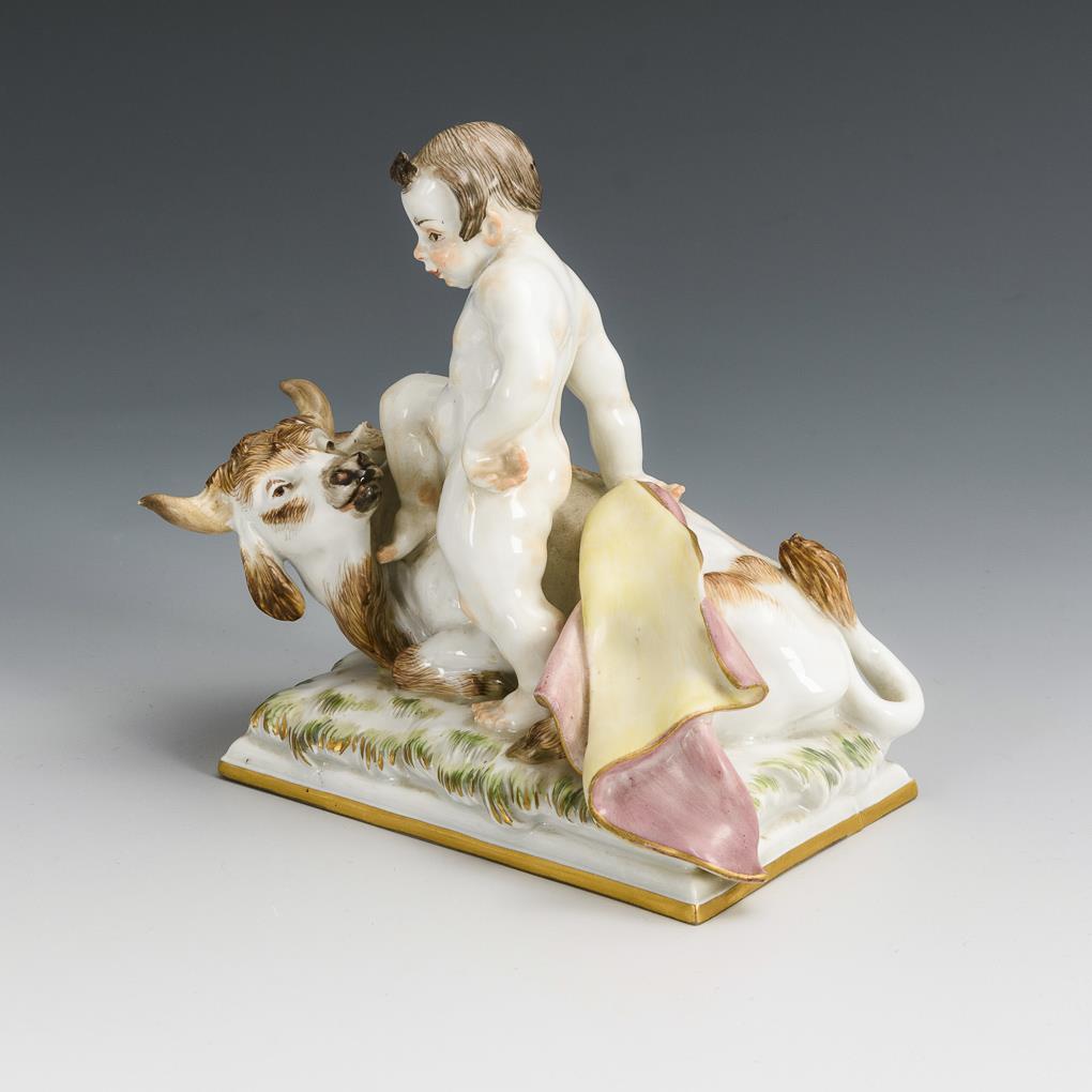 Sich auf einen liegenden Stier stützender Putto. Bestoßung am Tuch des Putto, 2 Brandrisse im Sockel.