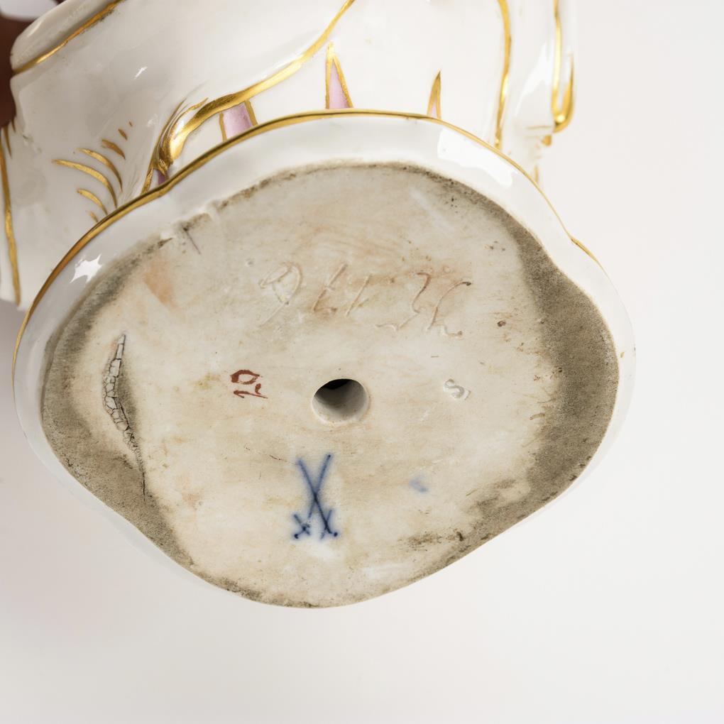 Auf einem Rocaillesockel ruhender Puttenkopf mit blüten- und ährengeschmücktem Hut. 1 Blüte bestoßen.
