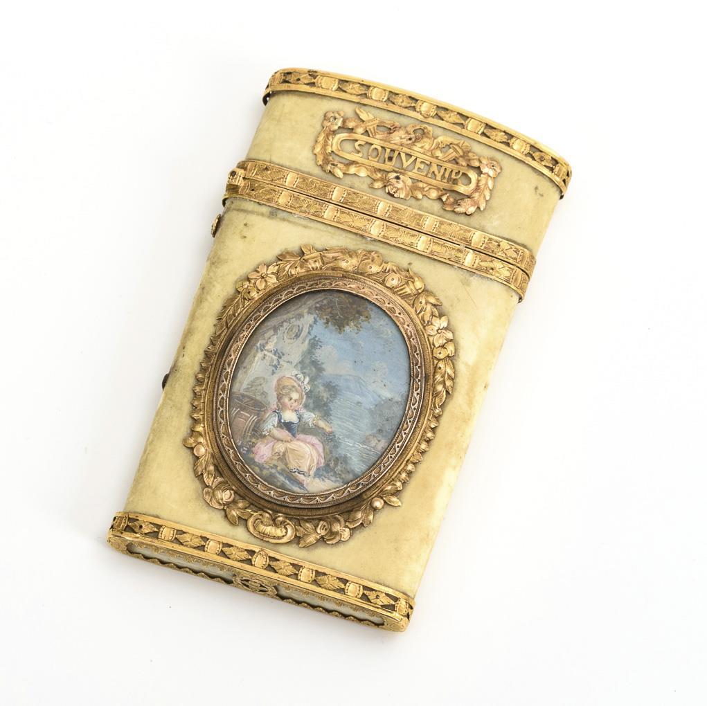 Spätbarockes Ballbüchlein in flacher Köcherform mit reich reliefierter und teils á jour gearbeiteter Montierung sowie integrierter Schrift "Souvenir d'Amitie". Beidseitig je eine verglaste Miniatur: Mädchen bzw. Knabe am Ufer. Innen 3 fächerartige Notizblätter aus Elfenbein. 1 Notizblatt gerissen, Stift fehlt, einige Alters-/Gebrauchsspuren.