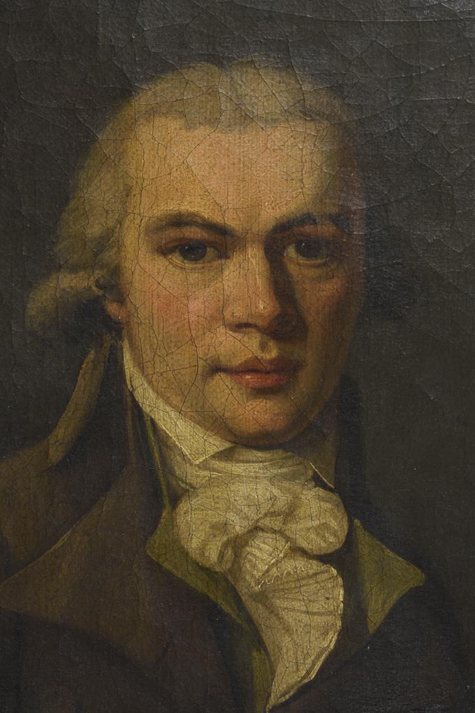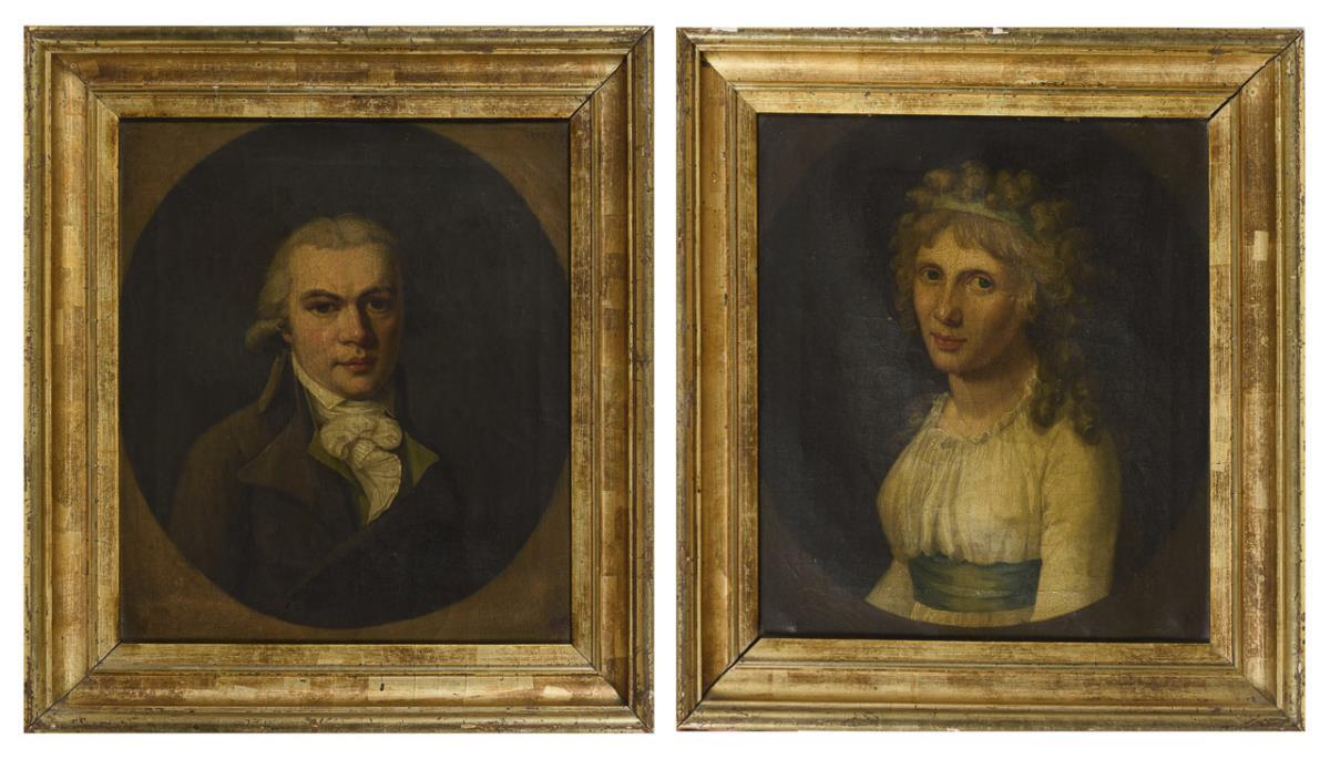In ovalem Bildausschnitt gemalte Bildnisse wohl eines Paares in der Kleidung um 1800 mit grauer Zopfperücke und Band im gelockten Haar. Je reinigungsbedürftig.