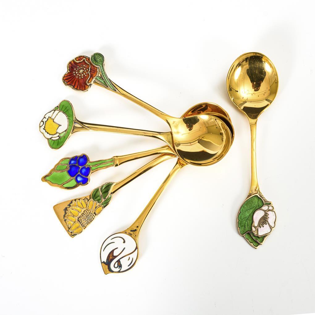 Sammellöffel mit farbig emaillierten Tier- und Blütenmotiven.