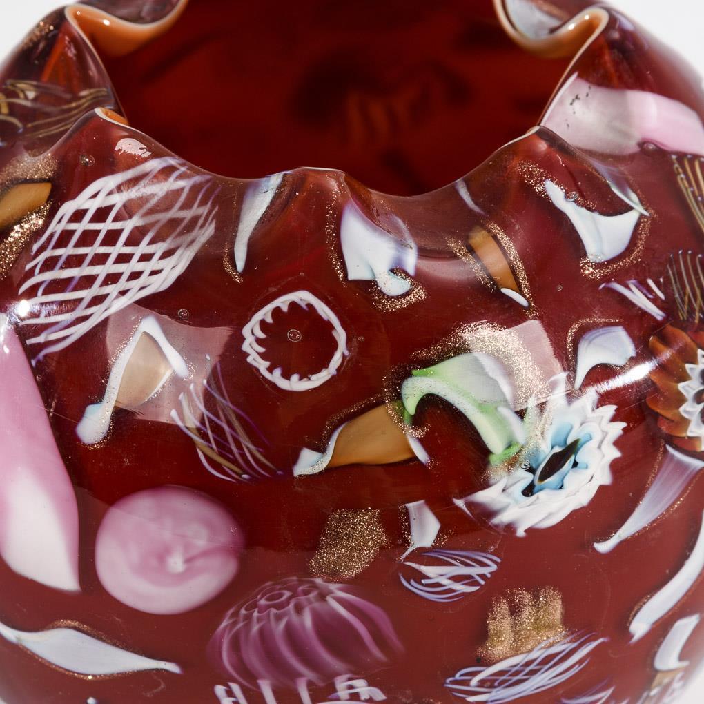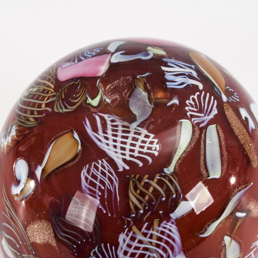 Farbloses Glas mit opalweißem und rotem Innenfang sowie in der Zwischenschicht eingeschmolzenen Fadennetzen, Millefiori-Canes und Kupferfolie.