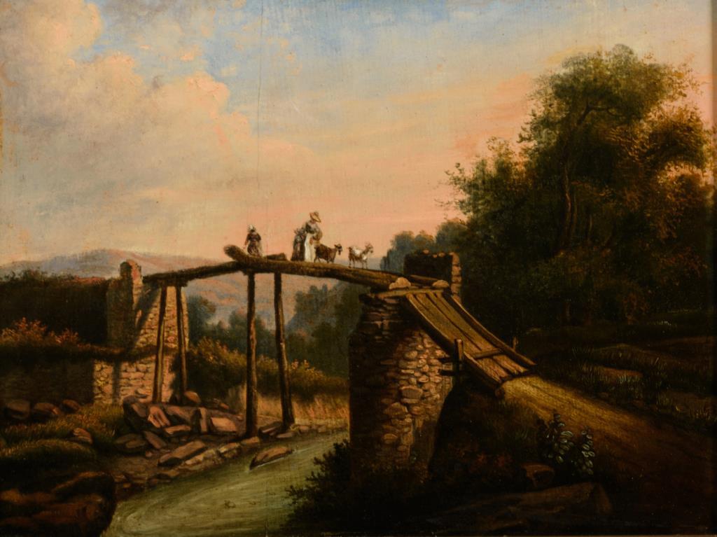 Landschaftsmaler um 1780: Holzbrücke über einem Flüsschen