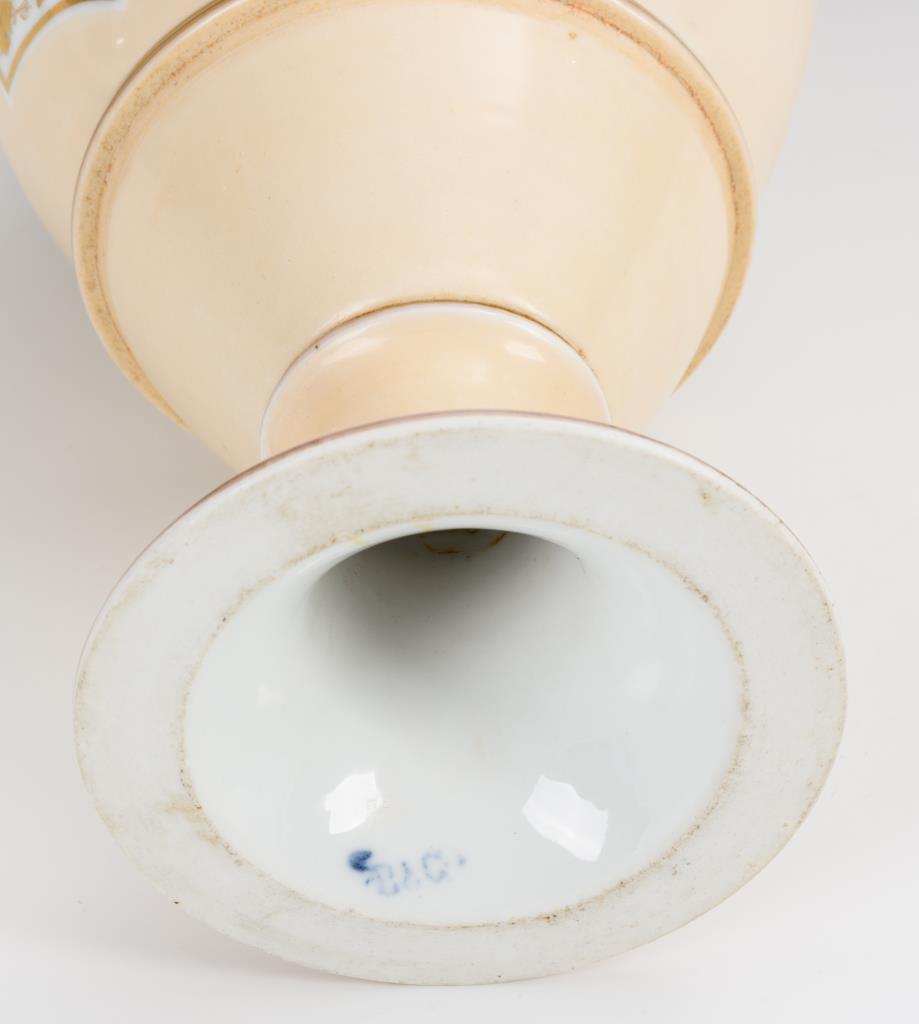 Ovoide Vase mit zwei Henkeln und Rundfuß. Beigefarbener Fond, schauseitig ein Medaillon mit einem antiken Frauenkopf. Gold berieben.