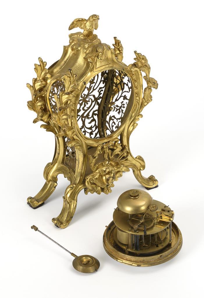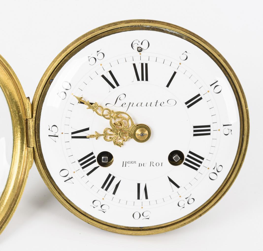 Ungemarktes Werk mit Halbstundenschlag auf Glocke. Schlagwerk funktioniert, Gehwerk läuft nicht. Weißes Emailzifferblatt mit römischen und arabischen Zahlen, Minutenkranz und Louis Quinze-Zeigern. Herstellerprägung Anzeige: "Lepaute, H[orlo]ger du Roi".